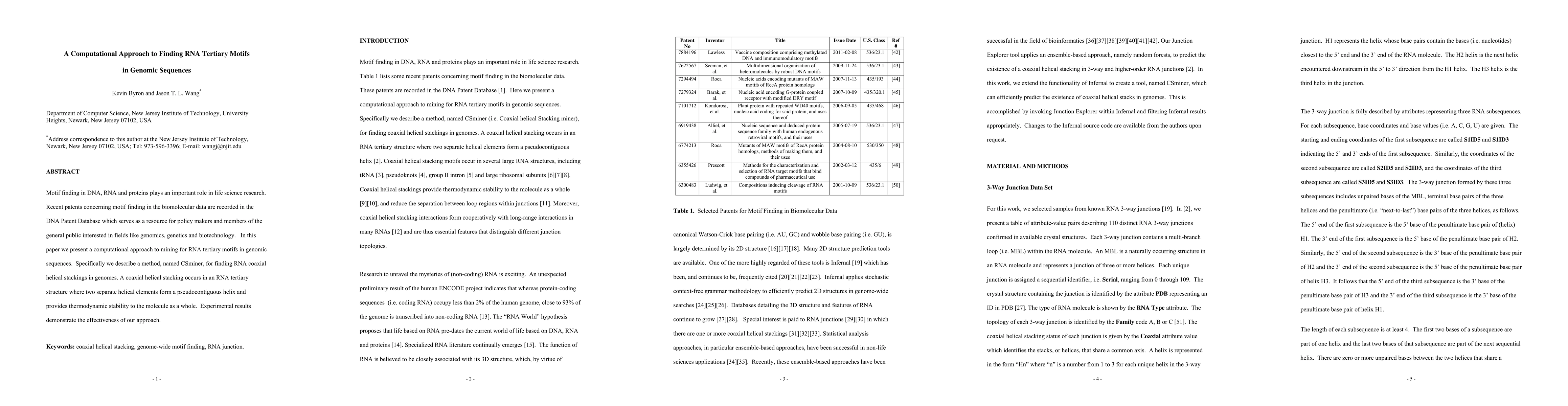 This paper introduces CSminer, a computational method for identifying RNA coaxial helical stackings—key tertiary motifs in RNA structures—within genomic sequences. Experimental results validate the effectiveness of CSminer in enhancing genomic research.