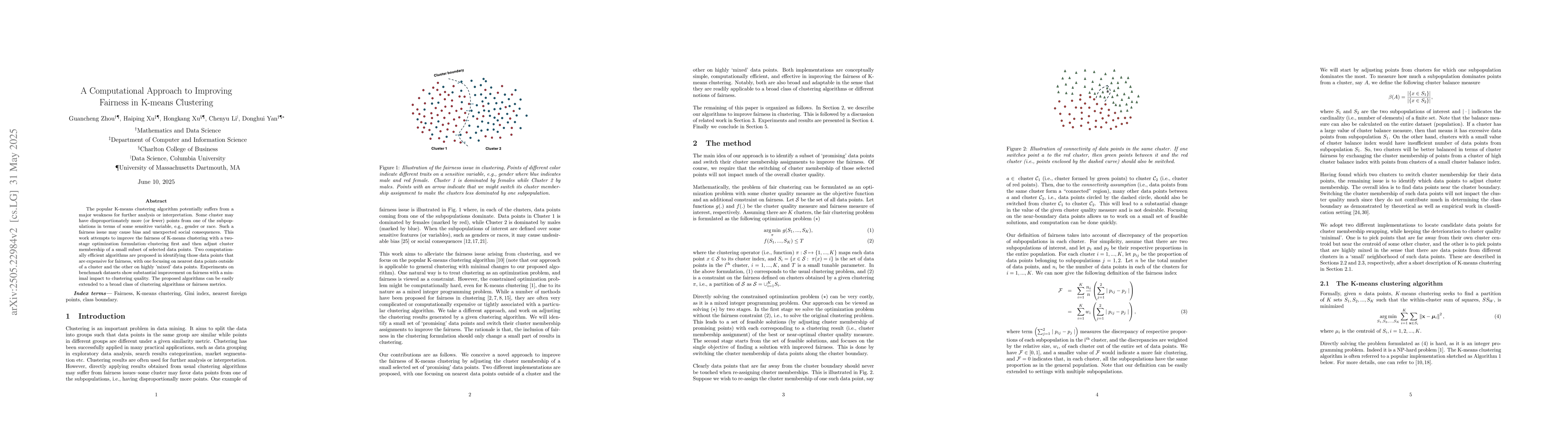 The paper presents two computationally efficient algorithms for identifying data points to adjust cluster memberships, improving fairness in K-means clustering without significantly affecting clustering quality.