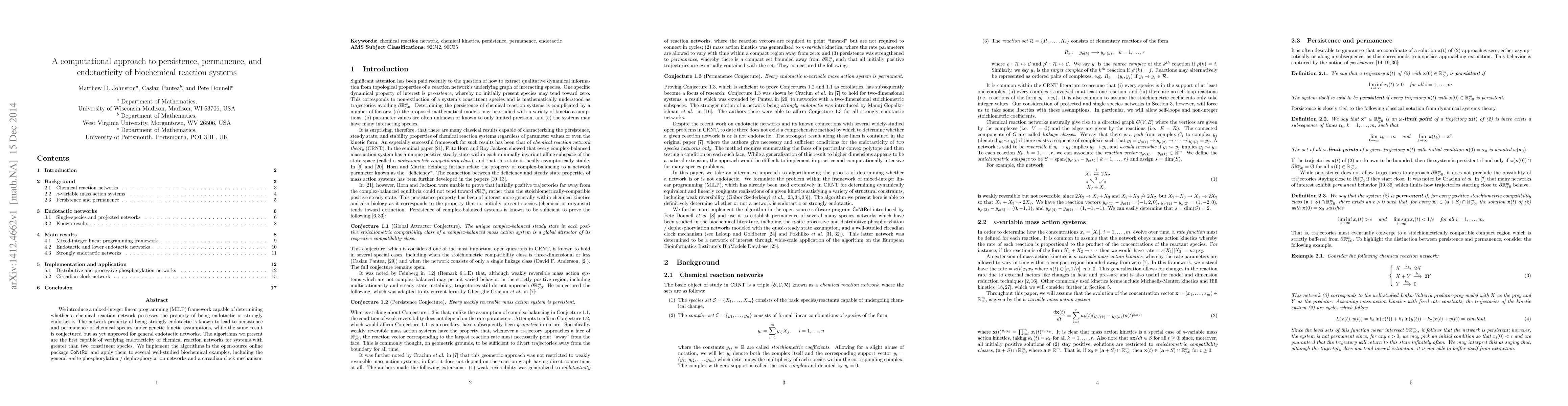 We introduce a mixed-integer linear programming (MILP) framework capable of determining whether a chemical reaction network possesses the property of being endotactic or strongly endotactic. The network property of being strongly endotactic is known to lead to persistence and permanence of chemical species under genetic kinetic assumptions, while the same result is conjectured but as yet unproved for general endotactic networks. The algorithms we present are the first capable of verifying endotacticity of chemical reaction networks for systems with greater than two constituent species. We implement the algorithms in the open-source online package CoNtRol and apply them to several well-studied biochemical examples, including the general $n$-site phosphorylation / dephosphorylation networks and a circadian clock mechanism.
