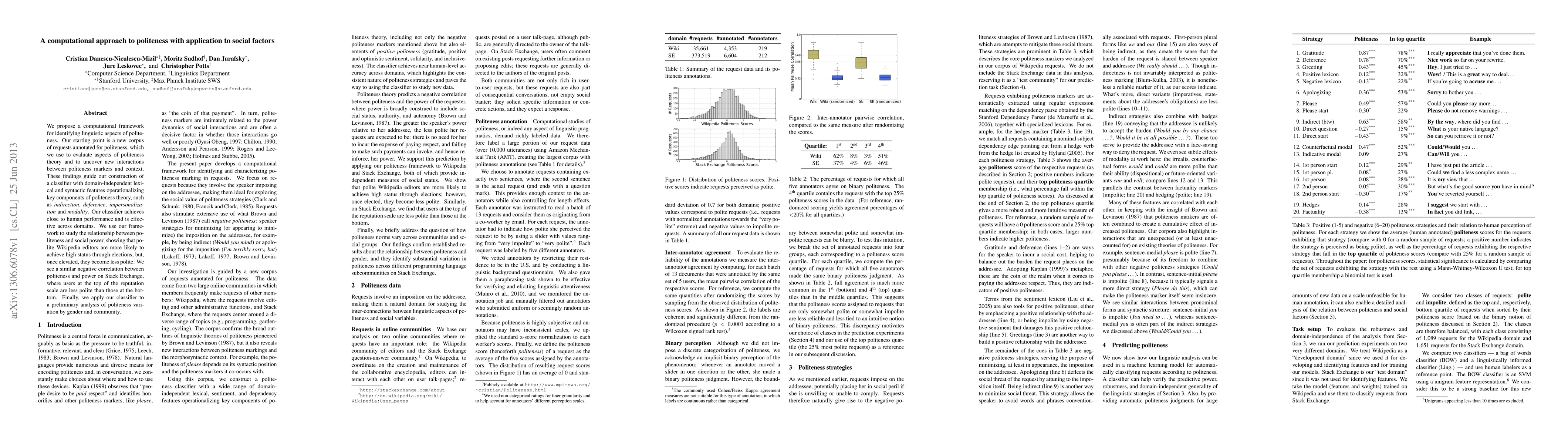 We propose a computational framework for identifying linguistic aspects of politeness. Our starting point is a new corpus of requests annotated for politeness, which we use to evaluate aspects of politeness theory and to uncover new interactions between politeness markers and context. These findings guide our construction of a classifier with domain-independent lexical and syntactic features operationalizing key components of politeness theory, such as indirection, deference, impersonalization and modality. Our classifier achieves close to human performance and is effective across domains. We use our framework to study the relationship between politeness and social power, showing that polite Wikipedia editors are more likely to achieve high status through elections, but, once elevated, they become less polite. We see a similar negative correlation between politeness and power on Stack Exchange, where users at the top of the reputation scale are less polite than those at the bottom. Finally, we apply our classifier to a preliminary analysis of politeness variation by gender and community.