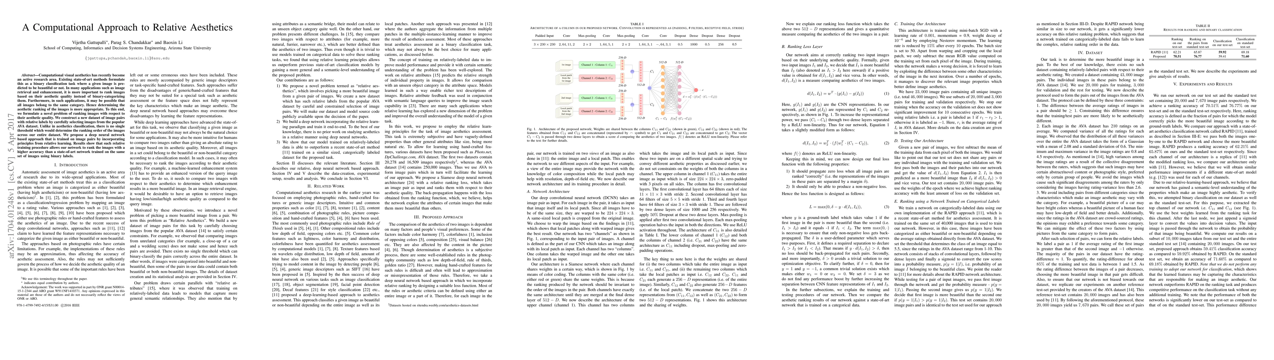 This paper introduces a novel computational approach to ranking images based on their aesthetic quality using a deep neural network trained on image pairs. Unlike binary classification, this method focuses on relative aesthetics, allowing for more nuanced ranking and demonstrating higher accuracy compared to traditional methods.