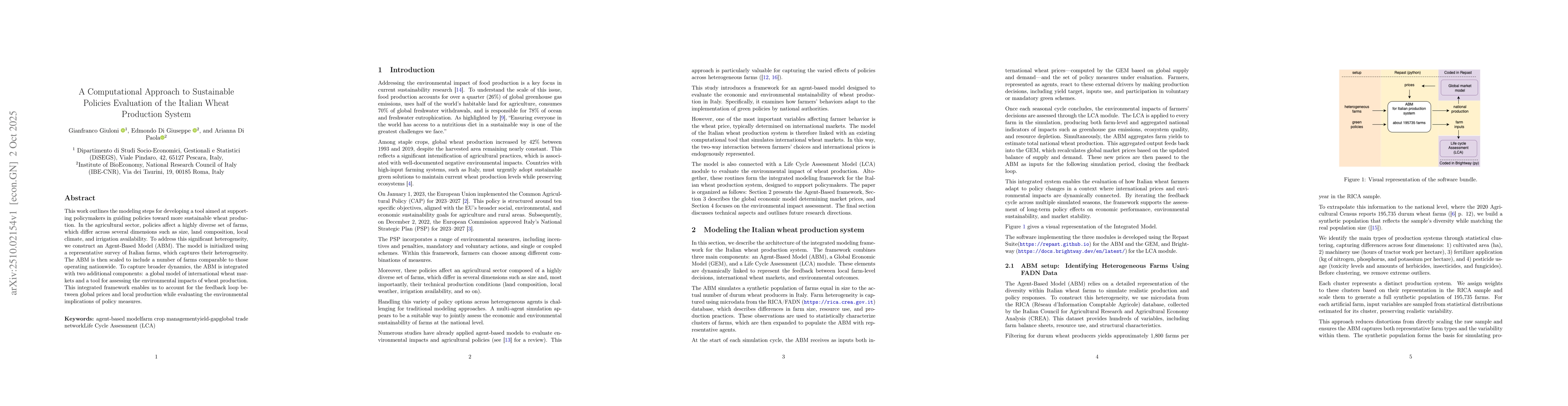 The study employs an Agent-Based Model (ABM) integrated with a Global Economic Model (GEM) and Life Cycle Assessment (LCA) to simulate and evaluate the impact of sustainable policies on Italian wheat production systems. The ABM is initialized using a synthetic population of 195,735 farms derived from the RICA dataset, capturing farm heterogeneity across four dimensions: cultivated area, machinery use, fertilizer application, and pesticide usage. The GEM simulates global wheat market dynamics, while the LCA quantifies environmental impacts using the ReCiPe 2016 framework.