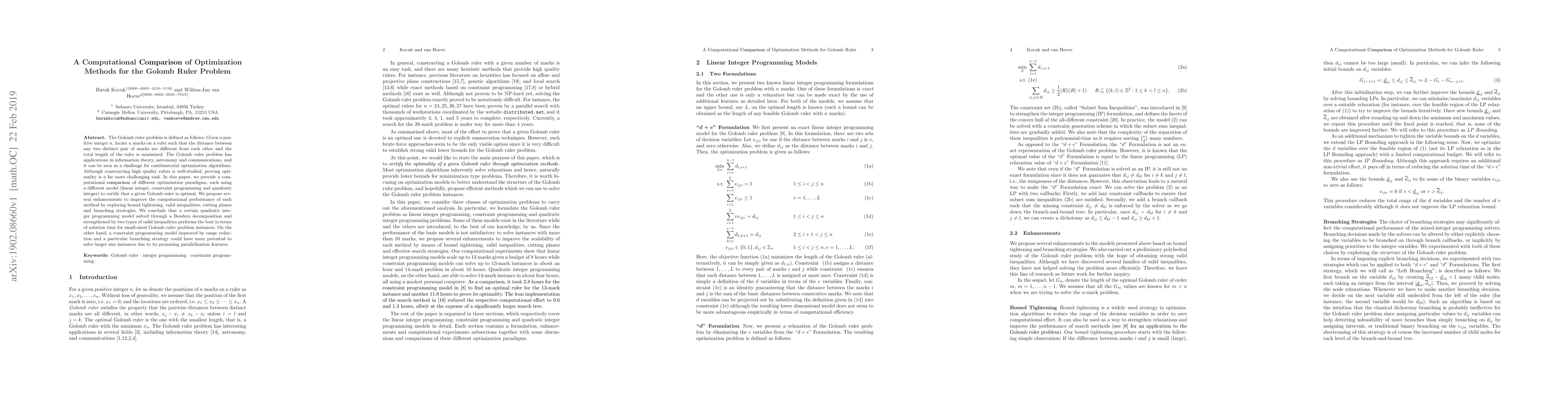 The Golomb ruler problem is defined as follows: Given a positive integer n, locate n marks on a ruler such that the distance between any two distinct pair of marks are different from each other and the total length of the ruler is minimized. The Golomb ruler problem has applications in information theory, astronomy and communications, and it can be seen as a challenge for combinatorial optimization algorithms. Although constructing high quality rulers is well-studied, proving optimality is a far more challenging task. In this paper, we provide a computational comparison of different optimization paradigms, each using a different model (linear integer, constraint programming and quadratic integer) to certify that a given Golomb ruler is optimal. We propose several enhancements to improve the computational performance of each method by exploring bound tightening, valid inequalities, cutting planes and branching strategies. We conclude that a certain quadratic integer programming model solved through a Benders decomposition and strengthened by two types of valid inequalities performs the best in terms of solution time for small-sized Golomb ruler problem instances. On the other hand, a constraint programming model improved by range reduction and a particular branching strategy could have more potential to solve larger size instances due to its promising parallelization features.