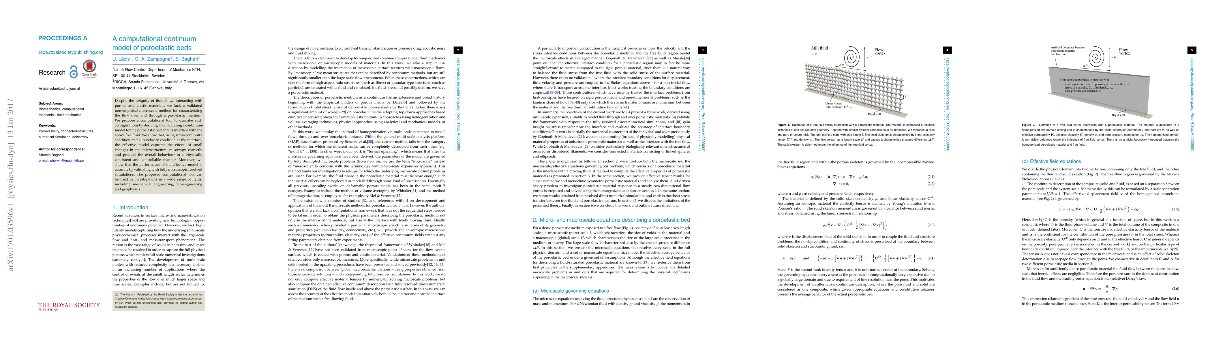 Despite the ubiquity of fluid flows interacting with porous and elastic materials, we lack a validated non-empirical macroscale method for characterizing the flow over and through a poroelastic medium. We propose a computational tool to describe such configurations by deriving and validating a continuum model for the poroelastic bed and its interface with the above free fluid. We show that, using stress continuity condition and slip velocity condition at the interface, the effective model captures the effects of small changes in the microstructure anisotropy correctly and predicts the overall behaviour in a physically consistent and controllable manner. Moreover, we show that the performance of the effective model is accurate by validating with fully microscopic resolved simulations. The proposed computational tool can be used in investigations in a wide range of fields, including mechanical engineering, bio-engineering and geophysics.