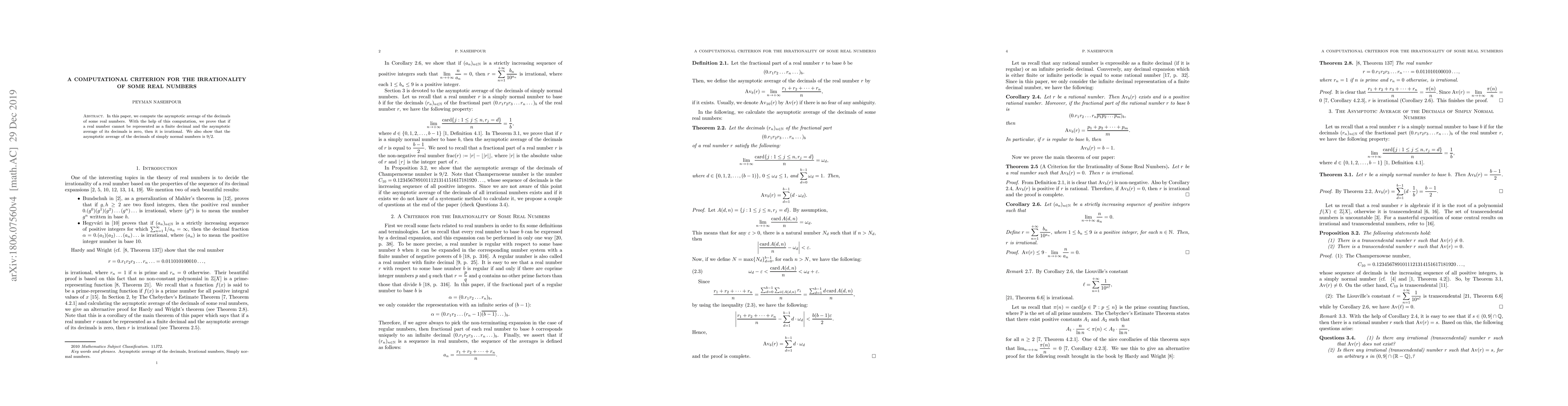 In this paper, we compute the asymptotic average of the decimals of some real numbers. With the help of this computation, we prove that if a real number cannot be represented as a finite decimal and the asymptotic average of its decimals is zero, then it is irrational. We also show that the asymptotic average of the decimals of simply normal numbers is 9/2.