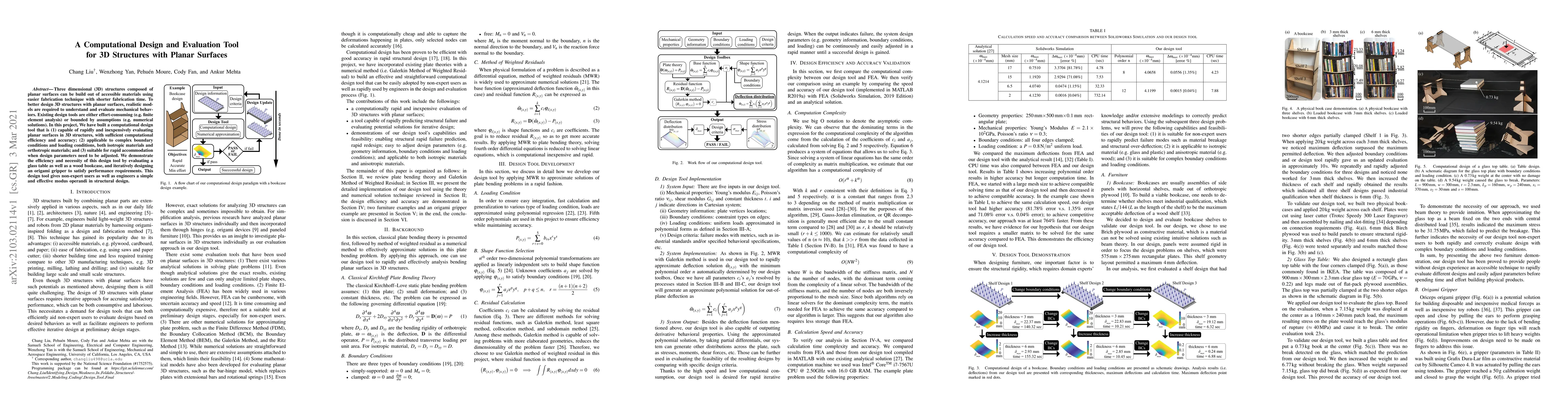 Three dimensional (3D) structures composed of planar surfaces can be build out of accessible materials using easier fabrication technique with shorter fabrication time. To better design 3D structures with planar surfaces, realistic models are required to understand and evaluate mechanical behaviors. Existing design tools are either effort-consuming (e.g. finite element analysis) or bounded by assumptions (e.g. numerical solutions). In this project, We have built a computational design tool that is (1) capable of rapidly and inexpensively evaluating planar surfaces in 3D structures, with sufficient computational efficiency and accuracy; (2) applicable to complex boundary conditions and loading conditions, both isotropic materials and orthotropic materials; and (3) suitable for rapid accommodation when design parameters need to be adjusted. We demonstrate the efficiency and necessity of this design tool by evaluating a glass table as well as a wood bookcase, and iteratively designing an origami gripper to satisfy performance requirements. This design tool gives non-expert users as well as engineers a simple and effective modus operandi in structural design.