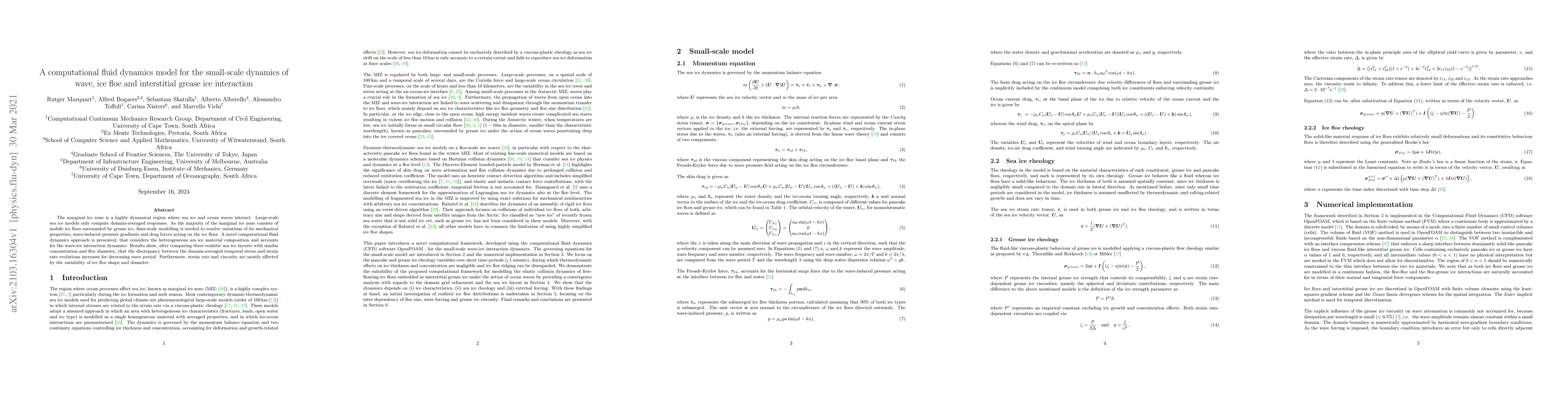 This paper introduces a computational fluid dynamics model to study the small-scale dynamics of wave, ice floe, and grease ice interactions in the marginal ice zone. The model reveals that finer-scale simulations are crucial for understanding mechanical properties and forces acting on ice floes, with variations in floe shape and diameter significantly affecting strain rate and viscosity.