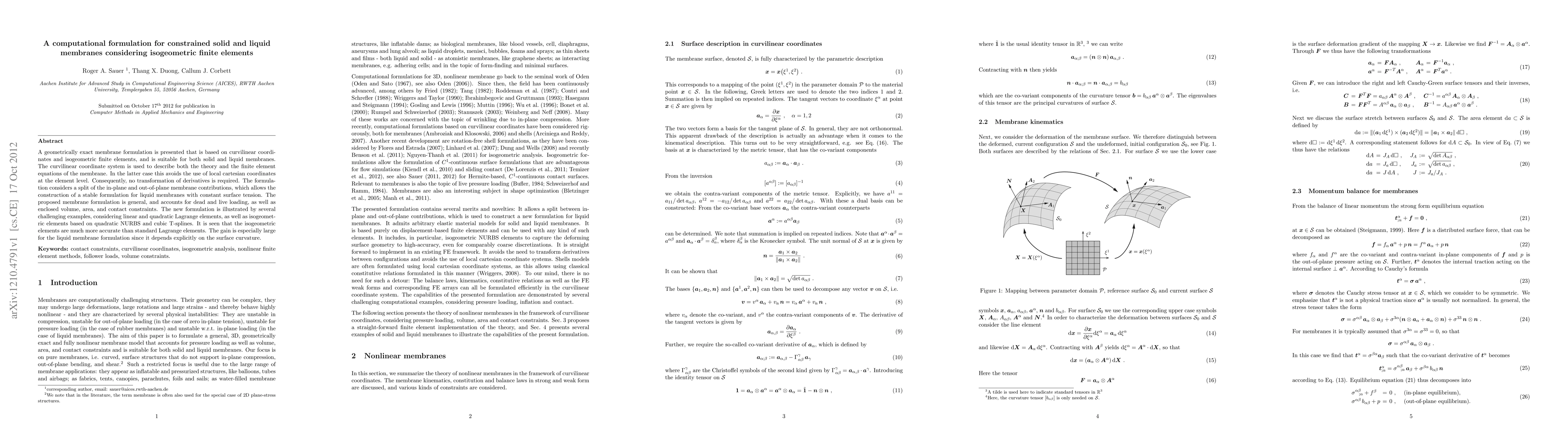 This paper presents a geometrically exact membrane formulation using isogeometric finite elements based on curvilinear coordinates, suitable for both solid and liquid membranes. It achieves higher accuracy, especially for liquid membranes, by avoiding transformations and considering membrane contributions separately.