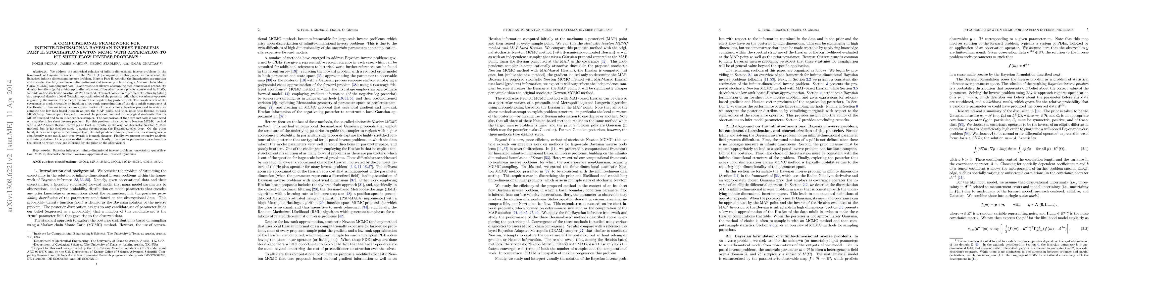 This paper proposes a computationally efficient stochastic Newton MCMC method for solving fully nonlinear infinite-dimensional Bayesian inverse problems, specifically applied to ice sheet flow. It introduces a low-rank approximation to the Hessian, computed only at the MAP point, which significantly reduces computational cost while maintaining rapid convergence compared to the original method and independence sampler.