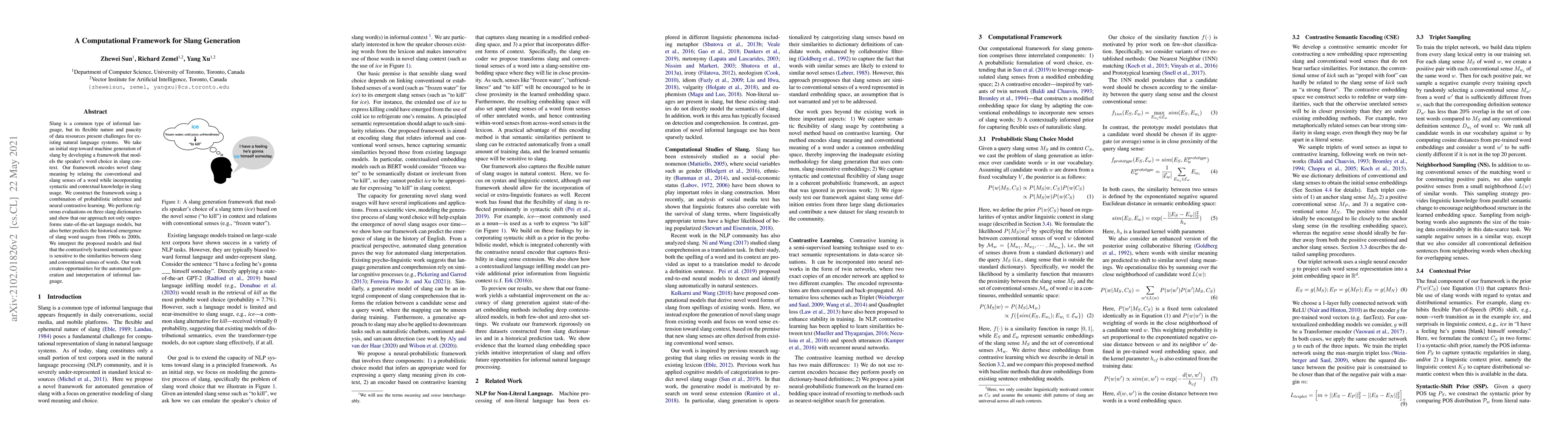 Slang is a common type of informal language, but its flexible nature and paucity of data resources present challenges for existing natural language systems. We take an initial step toward machine generation of slang by developing a framework that models the speaker's word choice in slang context. Our framework encodes novel slang meaning by relating the conventional and slang senses of a word while incorporating syntactic and contextual knowledge in slang usage. We construct the framework using a combination of probabilistic inference and neural contrastive learning. We perform rigorous evaluations on three slang dictionaries and show that our approach not only outperforms state-of-the-art language models, but also better predicts the historical emergence of slang word usages from 1960s to 2000s. We interpret the proposed models and find that the contrastively learned semantic space is sensitive to the similarities between slang and conventional senses of words. Our work creates opportunities for the automated generation and interpretation of informal language.