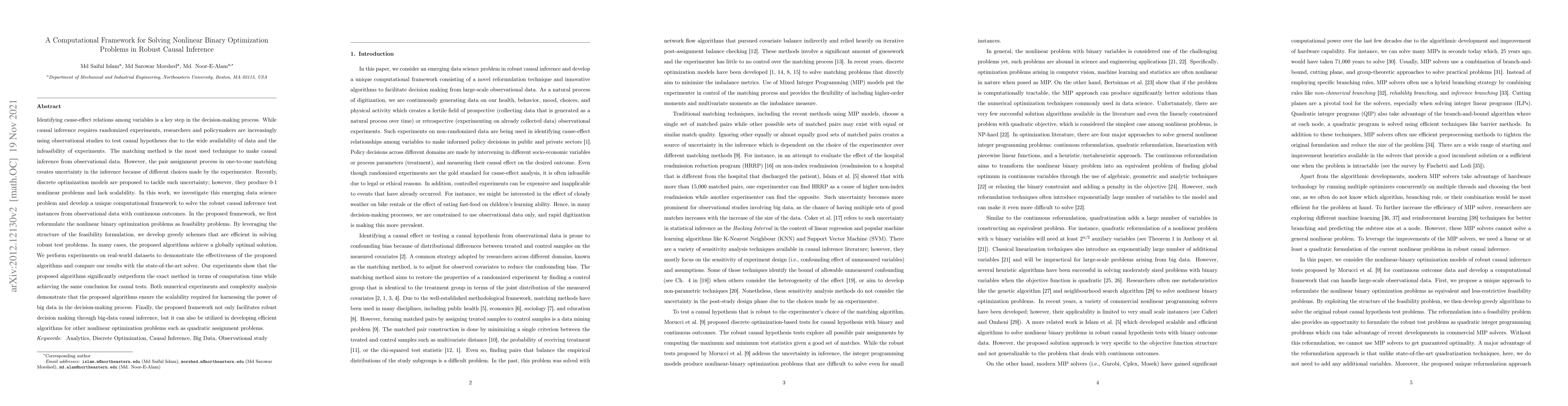 This paper proposes a computational framework using greedy algorithms to solve nonlinear binary optimization problems in robust causal inference from observational data. The algorithms reformulate the problems as feasibility issues, achieving global optimal solutions and significantly outperforming exact methods in computation time while maintaining accuracy.