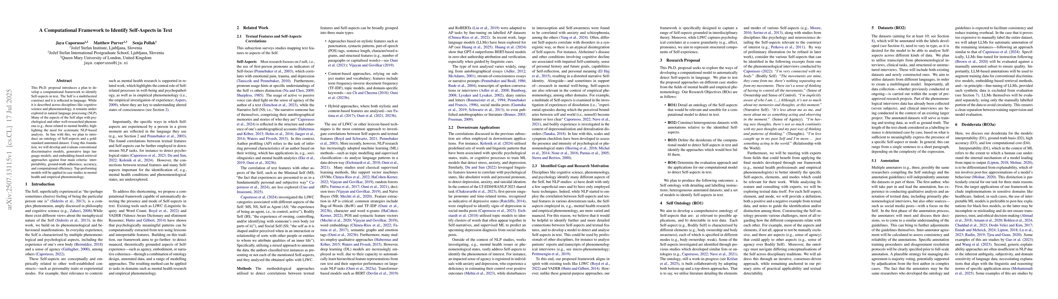 This Ph.D. proposal introduces a plan to develop a computational framework to identify Self-aspects in text. The Self is a multifaceted construct and it is reflected in language. While it is described across disciplines like cognitive science and phenomenology, it remains underexplored in natural language processing (NLP). Many of the aspects of the Self align with psychological and other well-researched phenomena (e.g., those related to mental health), highlighting the need for systematic NLP-based analysis. In line with this, we plan to introduce an ontology of Self-aspects and a gold-standard annotated dataset. Using this foundation, we will develop and evaluate conventional discriminative models, generative large language models, and embedding-based retrieval approaches against four main criteria: interpretability, ground-truth adherence, accuracy, and computational efficiency. Top-performing models will be applied in case studies in mental health and empirical phenomenology.