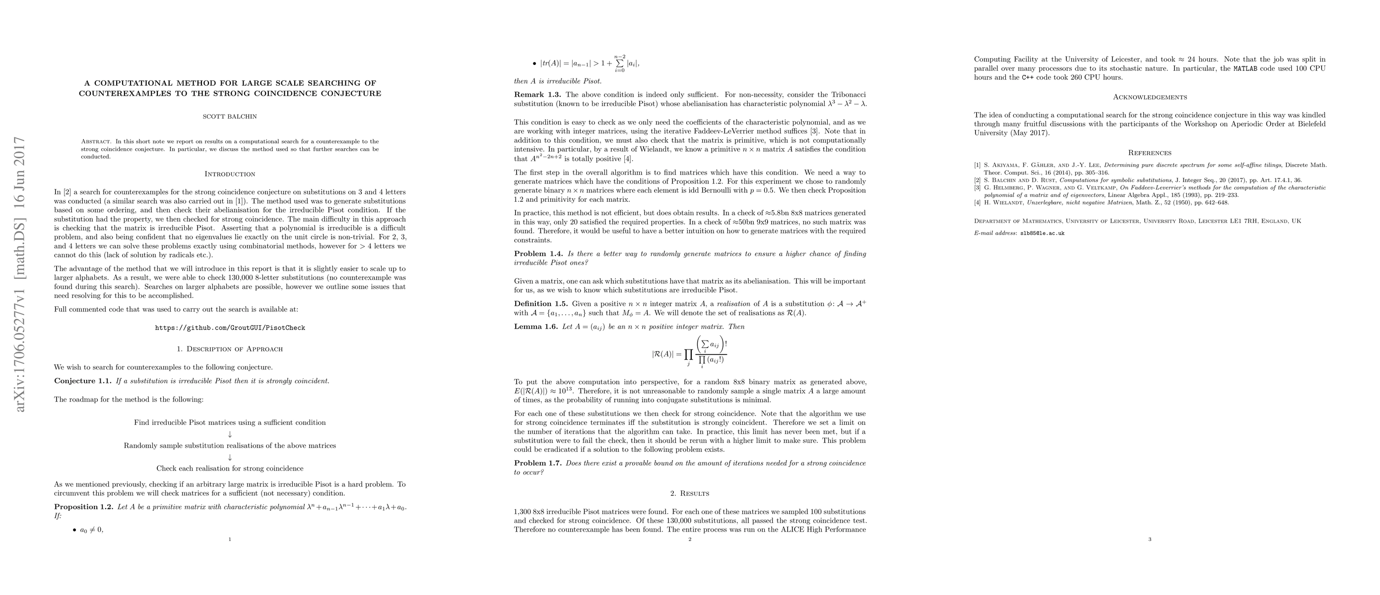 In this short note we report on results on a computational search for a counterexample to the strong coincidence conjecture. In particular, we discuss the method used so that further searches can be conducted.