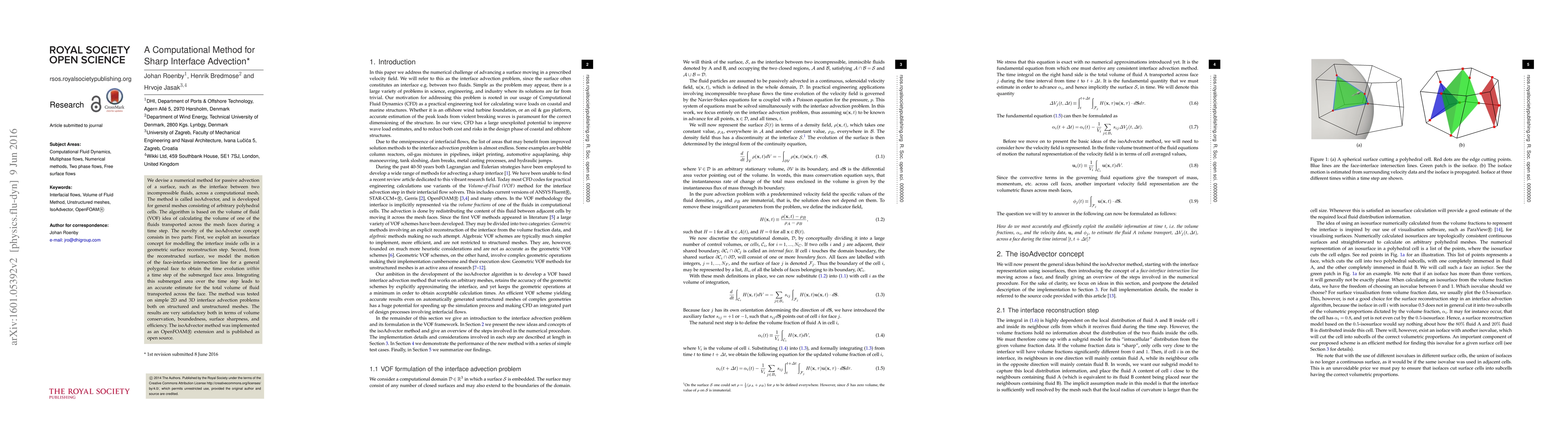The isoAdvector method is a computational technique for accurately advecting sharp interfaces across general meshes, utilizing geometric surface reconstruction and volume of fluid principles to ensure volume conservation and surface sharpness. The method was tested successfully on various 2D and 3D problems, demonstrating efficiency and high-quality results.