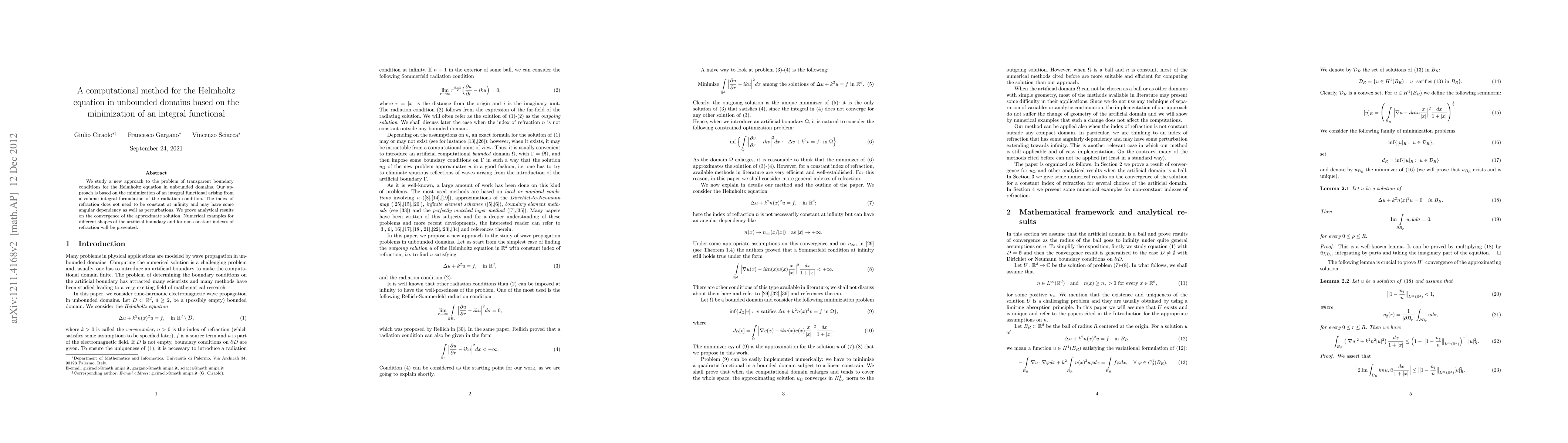This paper proposes a computational method for solving the Helmholtz equation in unbounded domains using transparent boundary conditions derived from minimizing an integral functional. The method accommodates non-constant and angular-dependent indexes of refraction and includes analytical convergence proofs, supplemented by numerical examples.