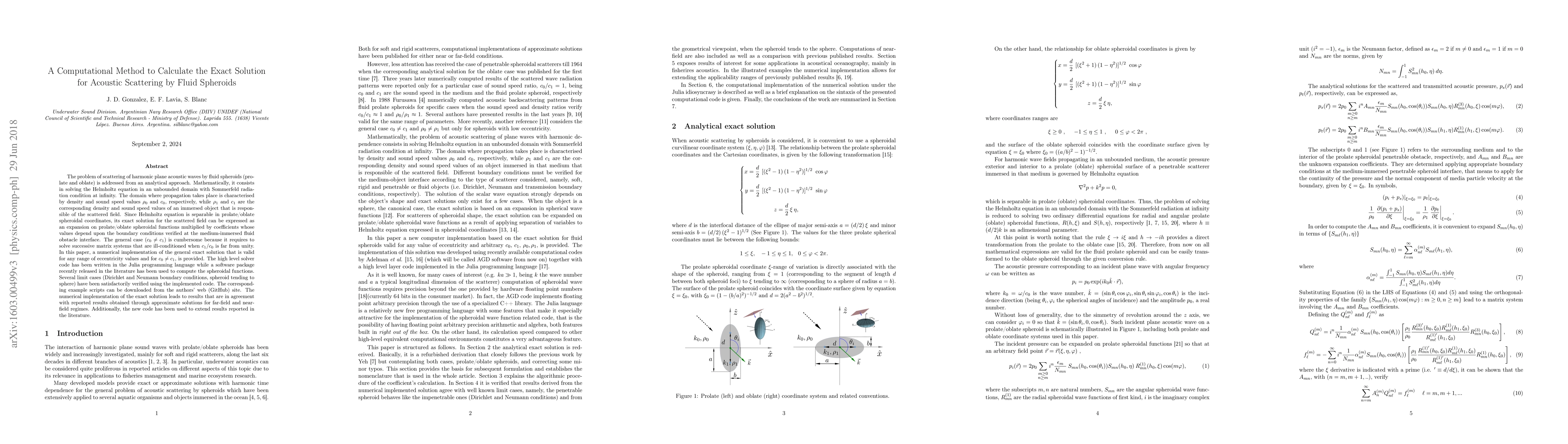 A new computational method calculates the exact solution for acoustic scattering by fluid spheroids, providing a valid solution for any range of eccentricity values and non-matching sound speeds.