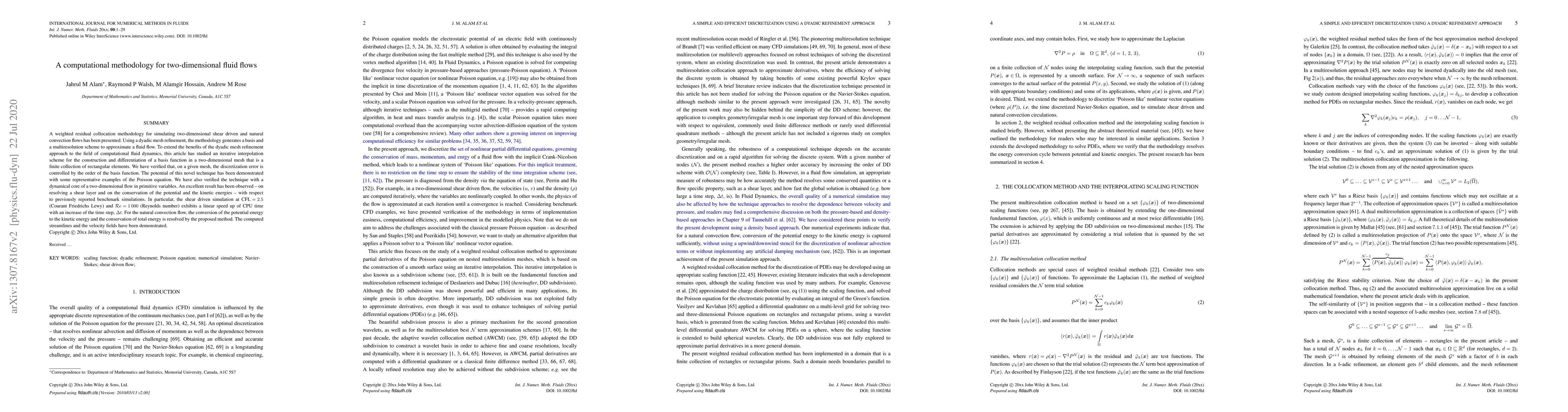 A weighted residual collocation methodology for simulating two-dimensional shear-driven and natural convection flows has been presented. Using a dyadic mesh refinement, the methodology generates a basis and a multiresolution scheme to approximate a fluid flow. To extend the benefits of the dyadic mesh refinement approach to the field of computational fluid dynamics, this article has studied an iterative interpolation scheme for the construction and differentiation of a basis function in a two-dimensional mesh that is a finite collection of rectangular elements. We have verified that, on a given mesh, the discretization error is controlled by the order of the basis function. The potential of this novel technique has been demonstrated with some representative examples of the Poisson equation. We have also verified the technique with a dynamical core of two-dimensional flow in primitive variables. An excellent result has been observed-on resolving a shear layer and on the conservation of the potential and the kinetic energies with respect to previously reported benchmark simulations. In particular, the shear-driven simulation at CFL = 2.5 (Courant-Friedrichs-Lewy) and $\mathcal Re = 1\,000$ (Reynolds number) exhibits a linear speedup of CPU time with an increase of the time step, $Delta t$. For the natural convection flow, the conversion of the potential energy to the kinetic energy and the conservation of total energy is resolved by the proposed method. The computed streamlines and the velocity fields have been demonstrated.