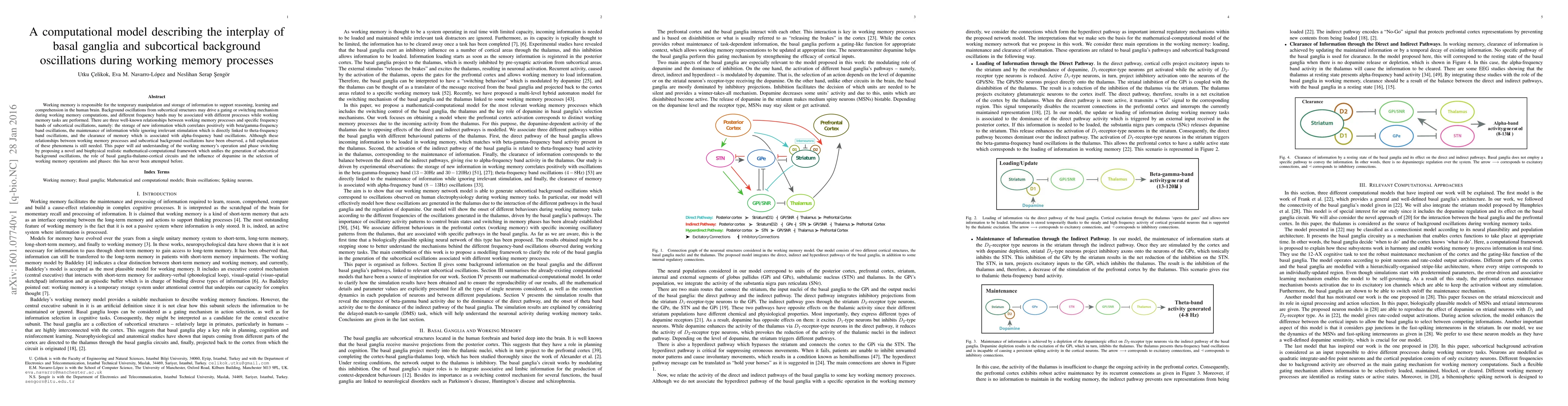 This paper proposes a novel computational model to describe how basal ganglia and subcortical background oscillations interact during working memory processes, aiming to unify the roles of basal ganglia-thalamo-cortical circuits, dopamine influence, and specific frequency bands of subcortical oscillations in working memory operations and phase switching.
