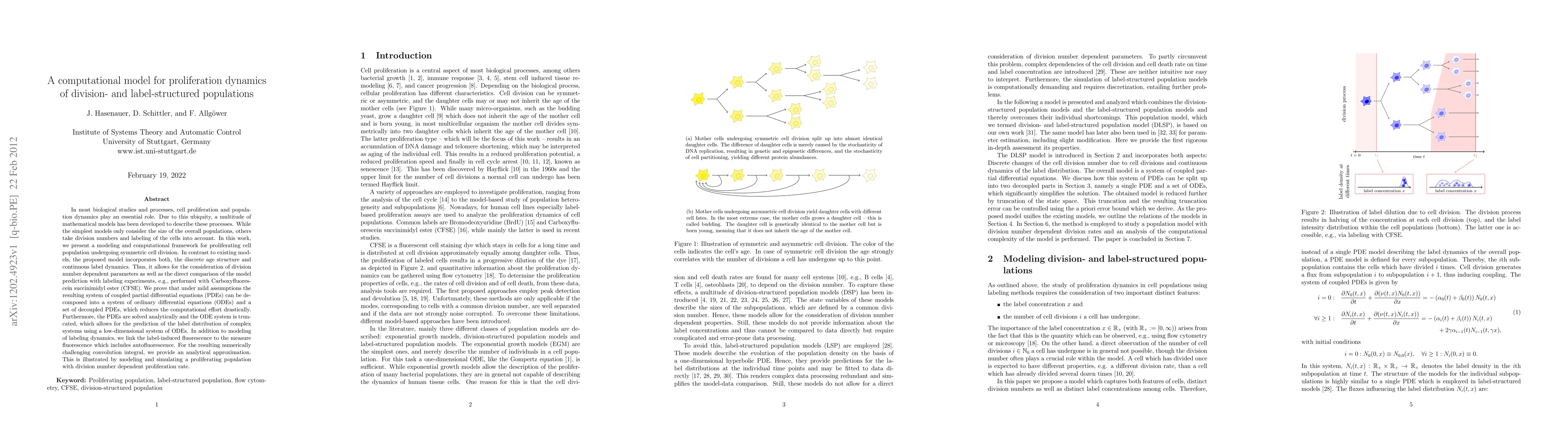 In most biological studies and processes, cell proliferation and population dynamics play an essential role. Due to this ubiquity, a multitude of mathematical models has been developed to describe these processes. While the simplest models only consider the size of the overall populations, others take division numbers and labeling of the cells into account. In this work, we present a modeling and computational framework for proliferating cell population undergoing symmetric cell division. In contrast to existing models, the proposed model incorporates both, the discrete age structure and continuous label dynamics. Thus, it allows for the consideration of division number dependent parameters as well as the direct comparison of the model prediction with labeling experiments, e.g., performed with Carboxyfluorescein succinimidyl ester (CFSE). We prove that under mild assumptions the resulting system of coupled partial differential equations (PDEs) can be decomposed into a system of ordinary differential equations (ODEs) and a set of decoupled PDEs, which reduces the computational effort drastically. Furthermore, the PDEs are solved analytically and the ODE system is truncated, which allows for the prediction of the label distribution of complex systems using a low-dimensional system of ODEs. In addition to modeling of labeling dynamics, we link the label-induced fluorescence to the measure fluorescence which includes autofluorescence. For the resulting numerically challenging convolution integral, we provide an analytical approximation. This is illustrated by modeling and simulating a proliferating population with division number dependent proliferation rate.