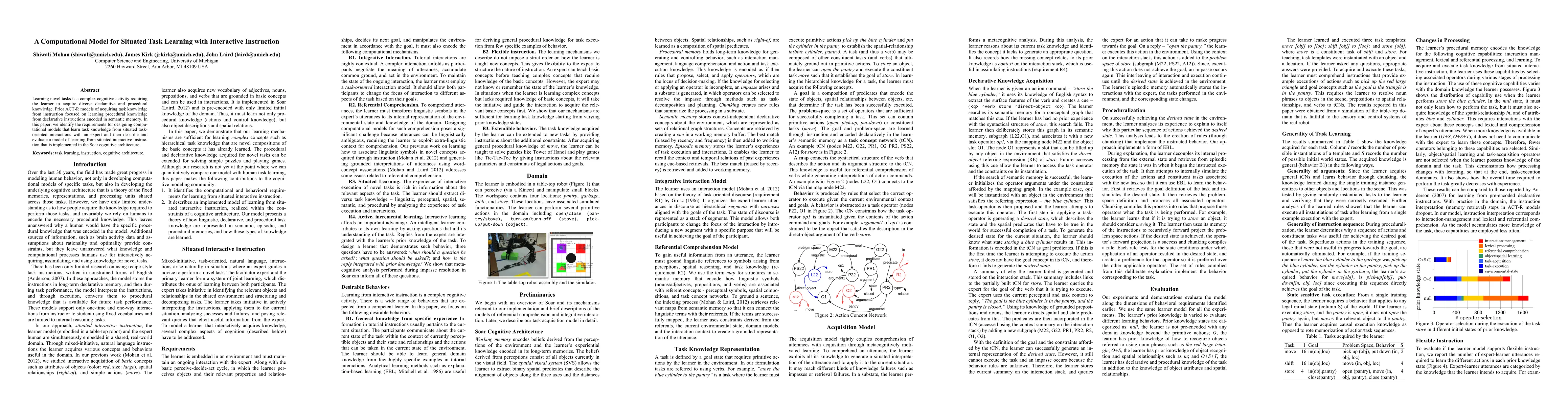 Learning novel tasks is a complex cognitive activity requiring the learner to acquire diverse declarative and procedural knowledge. Prior ACT-R models of acquiring task knowledge from instruction focused on learning procedural knowledge from declarative instructions encoded in semantic memory. In this paper, we identify the requirements for designing compu- tational models that learn task knowledge from situated task- oriented interactions with an expert and then describe and evaluate a model of learning from situated interactive instruc- tion that is implemented in the Soar cognitive architecture.