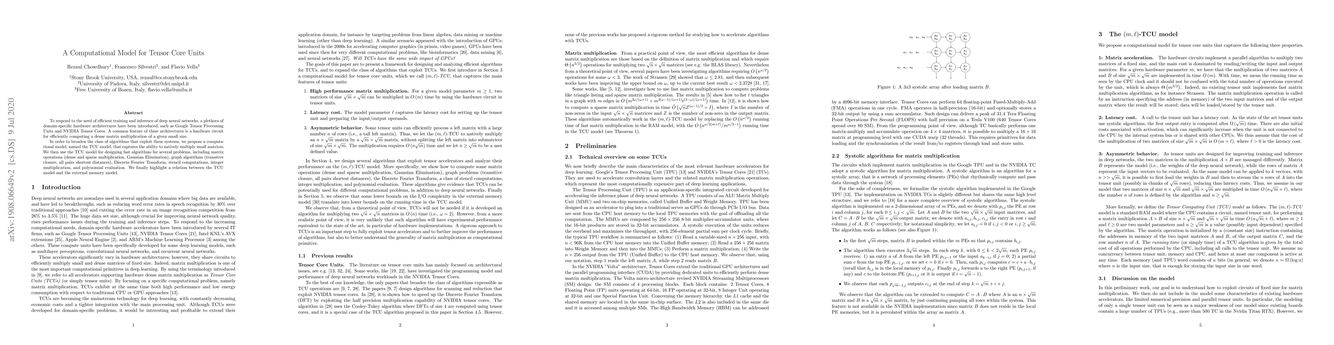 To respond to the need of efficient training and inference of deep neural networks, a plethora of domain-specific hardware architectures have been introduced, such as Google Tensor Processing Units and NVIDIA Tensor Cores. A common feature of these architectures is a hardware circuit for efficiently computing a dense matrix multiplication of a given small size. In order to broaden the class of algorithms that exploit these systems, we propose a computational model, named the TCU model, that captures the ability to natively multiply small matrices. We then use the TCU model for designing fast algorithms for several problems, including matrix operations (dense and sparse multiplication, Gaussian Elimination), graph algorithms (transitive closure, all pairs shortest distances), Discrete Fourier Transform, stencil computations, integer multiplication, and polynomial evaluation. We finally highlight a relation between the TCU model and the external memory model.