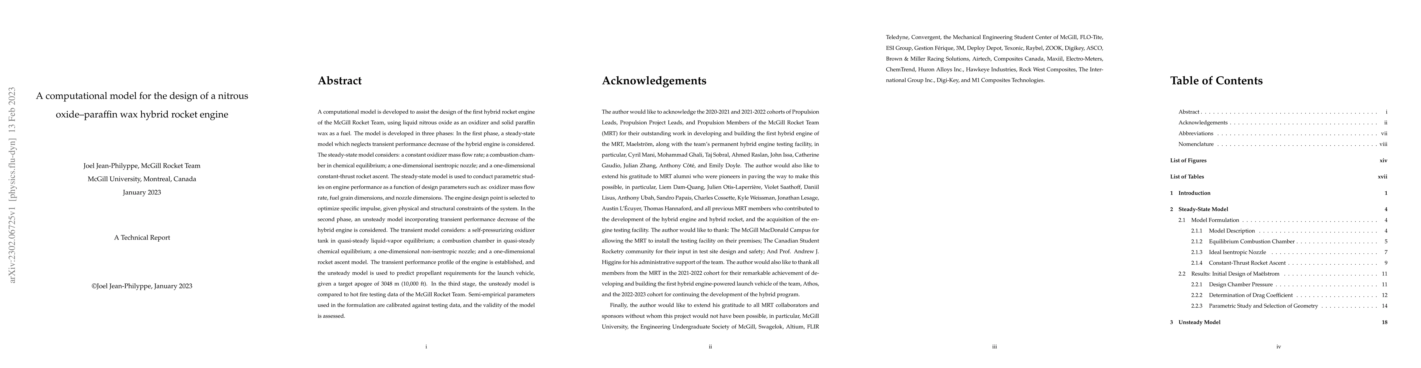 This paper develops a computational model in three phases to design a nitrous oxide-paraffin wax hybrid rocket engine, optimizing specific impulse and predicting propellant requirements, with validation against experimental data from McGill Rocket Team tests.