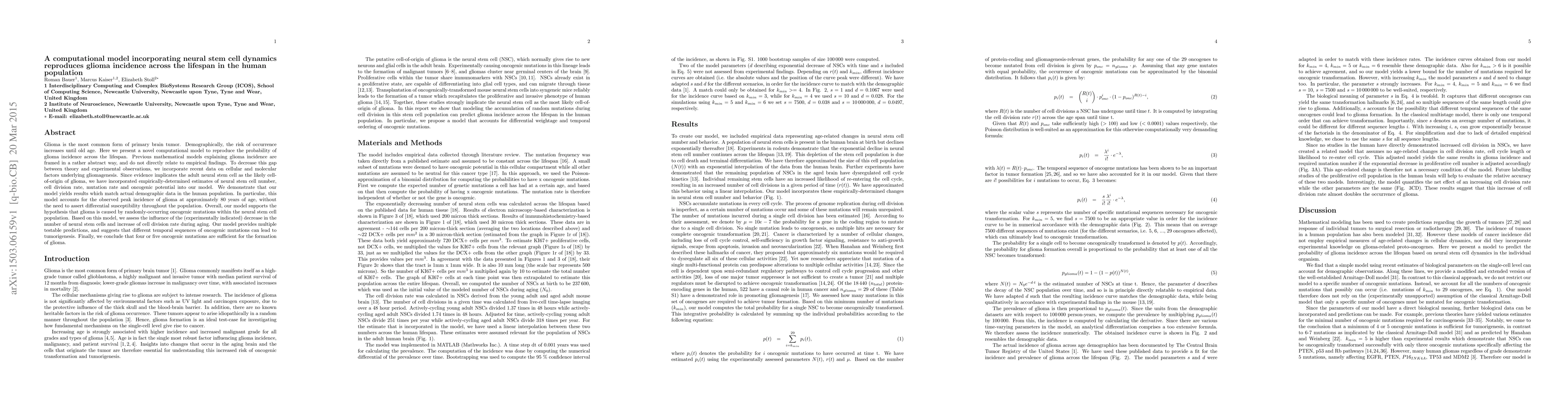 This paper introduces a computational model that integrates neural stem cell dynamics to reproduce glioma incidence across human lifespan, aligning with empirical data and suggesting that glioma arises from oncogenic mutations in neural stem cells. The model predicts that four or five mutations are sufficient for tumor formation, offering testable hypotheses and insights into glioma's age-related incidence.