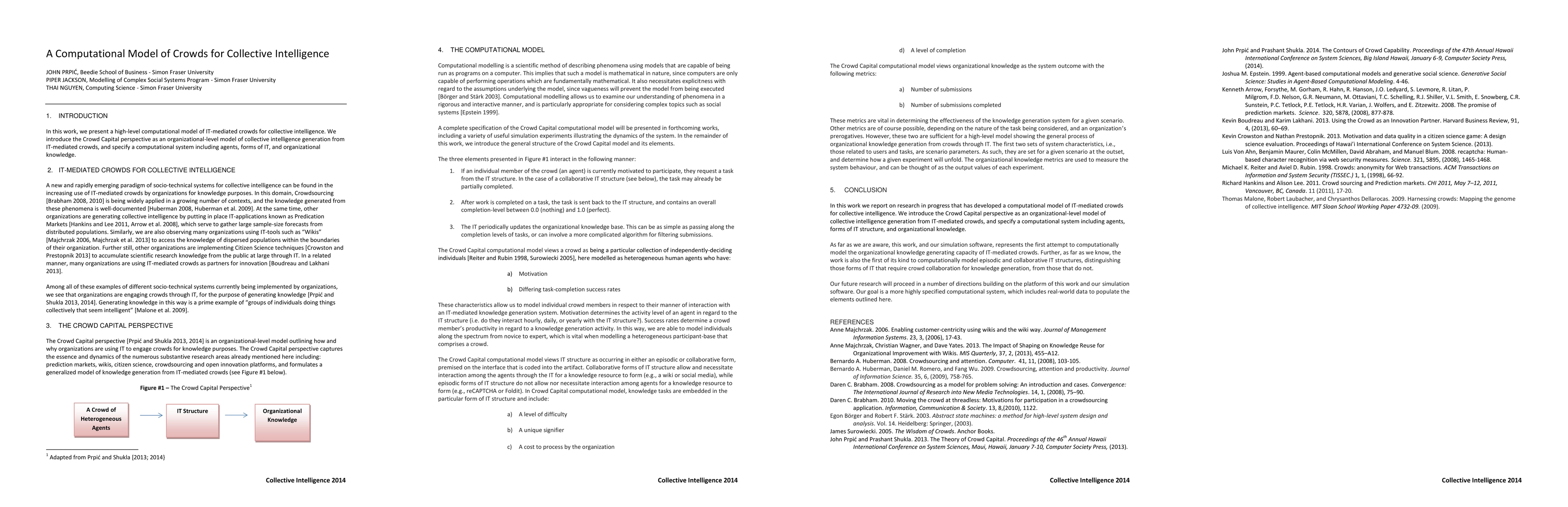 This paper introduces a computational model for IT-mediated crowds to generate collective intelligence, termed the Crowd Capital perspective, which includes agents, IT forms, and organizational knowledge. The model aims to enhance understanding of how crowds can collectively produce intelligent outcomes.
