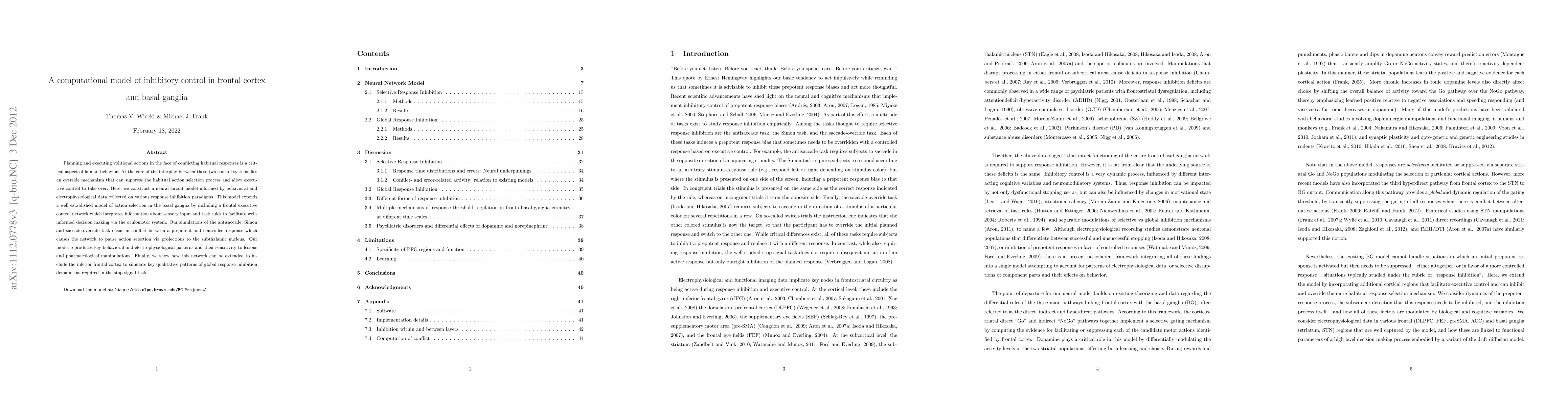 This paper constructs a neural circuit model integrating frontal cortex and basal ganglia to simulate inhibitory control during conflicting action selection. The model reproduces behavioral and electrophysiological patterns in tasks like antisaccade and stop-signal, demonstrating its ability to represent the override mechanism for habitual responses.
