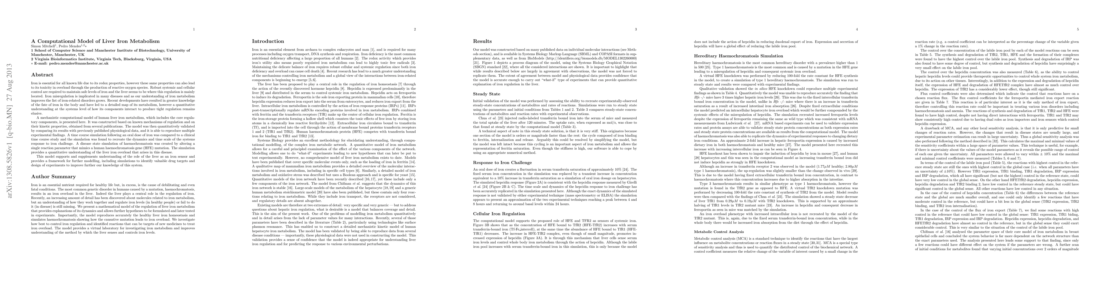 This paper presents a computational model of human liver iron metabolism, detailing the regulatory mechanisms and their interactions. The model accurately reproduces physiological responses to iron challenges and simulates liver iron overload in haemochromatosis, aiding in the understanding of liver's role in iron regulation and potential drug target identification.