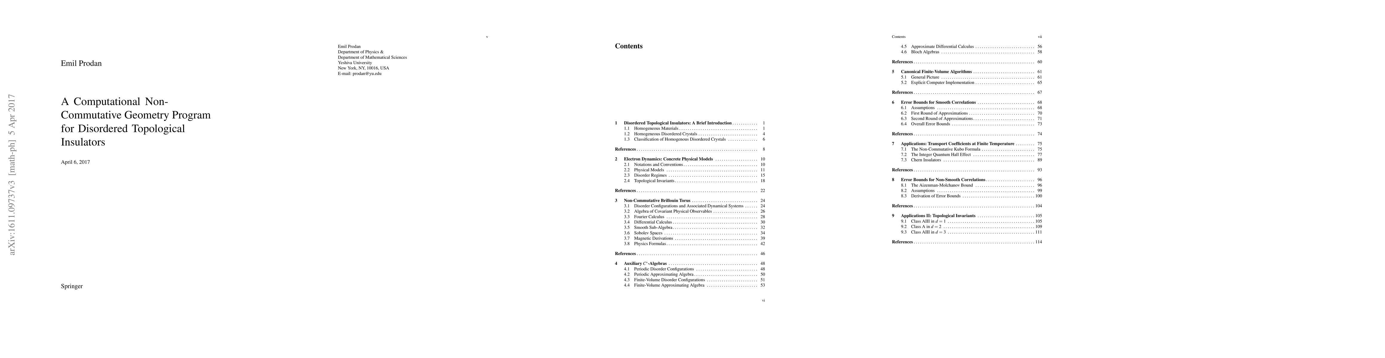 This paper introduces a computational program based on non-commutative geometry to study disordered topological insulators, presenting a classification table for topological phases and developing numerical algorithms for computing correlation functions. The program demonstrates rapid convergence to the thermodynamic limit and applies to various physical response functions.