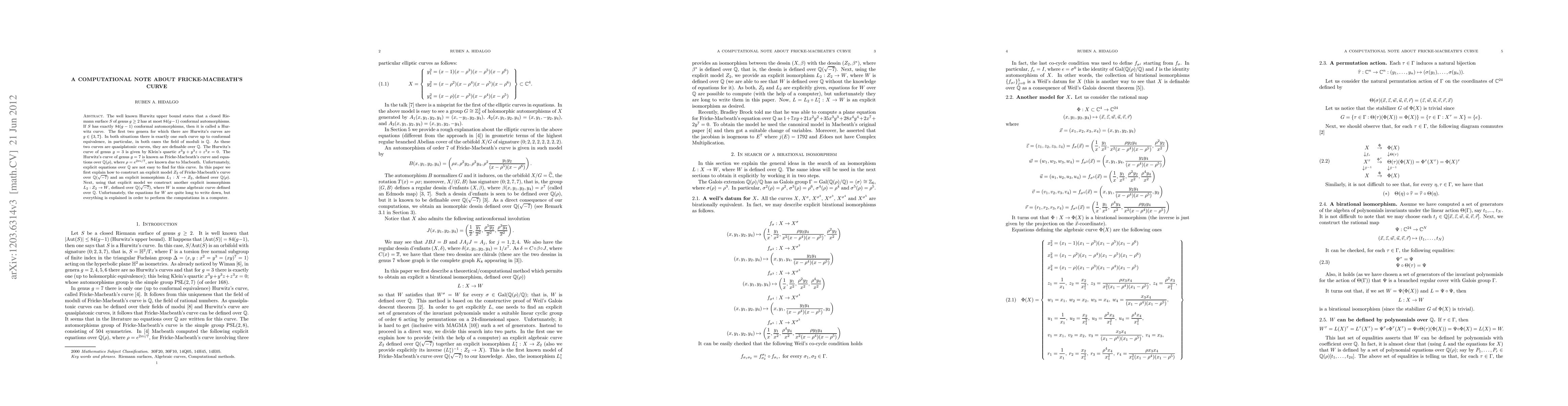 The well known Hurwitz upper bound states that a closed Riemann surface $S$ of genus $g \geq 2$ has at most $84(g-1)$ conformal automorphisms. If $S$ has exactly $84(g-1)$ conformal automorphisms, then it is called a Hurwitz curve. The first two genera for which there are Hurwitz's curves are $g \in \{3,7\}$. In both situations there is exactly one such curve up to conformal equivalence, in particular, in both cases the field of moduli is ${\mathbb Q}$. As these two curves are quasiplatonic curves, they are definable over ${\mathbb Q}$. The Hurwitz's curve of genus $g=3$ is given by Klein's quartic $x^3y+y^3z+z^3x=0$. The Hurwitz's curve of genus $g=7$ is known as Fricke-Macbeath's curve and equations over ${\mathbb Q}(\rho)$, where $\rho=e^{2 \pi i/7}$, are known due to Macbeath. Unfortunately, explicit equations over ${\mathbb Q}$ are not easy to find for this curve. In this paper we first explain how to construct an explicit model $Z_{2}$ of Fricke-Macbeath's curve over ${\mathbb Q}(\sqrt{-7})$ and an explicit isomorphism $L_{1}:X \to Z_{2}$, defined over ${\mathbb Q}(\rho)$. Next, using that explicit model we construct another explicit isomorphism $L_{2}:Z_{2} \to W$, defined over ${\mathbb Q}(\sqrt{-7})$, where $W$ is some algebraic curve defined over ${\mathbb Q}$. Unfortunately, the equations for $W$ are quite long to write down, but everything is explained in order to perform the computations in a computer.
