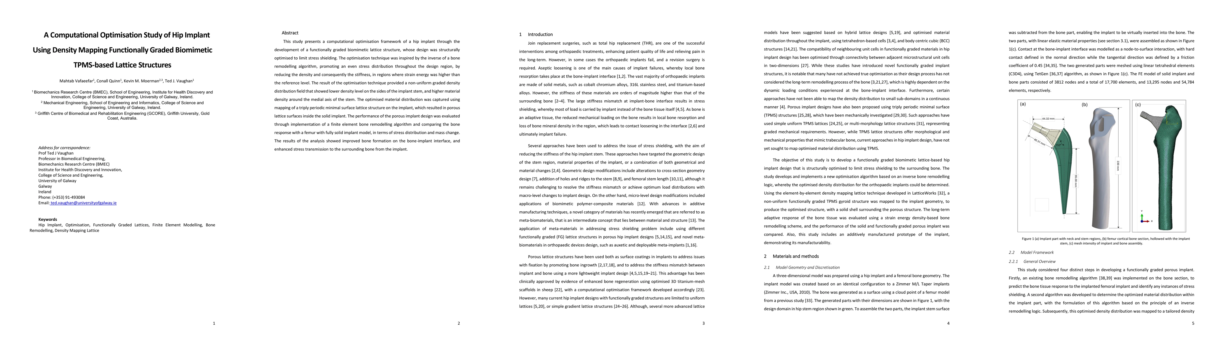 This study presents a computational optimisation framework of a hip implant through the development of a functionally graded biomimetic lattice structure, whose design was structurally optimised to limit stress shielding. The optimisation technique was inspired by the inverse of a bone remodelling algorithm, promoting an even stress distribution throughout the design region, by reducing the density and consequently the stiffness, in regions where strain energy was higher than the reference level. The result of the optimisation technique provided a non-uniform graded density distribution field that showed lower density level on the sides of the implant stem, and higher material density around the medial axis of the stem. The optimised material distribution was captured using mapping of a triply periodic minimal surface lattice structure on the implant, which resulted in porous lattice surfaces inside the solid implant. The performance of the porous implant design was evaluated through implementation of a finite element bone remodelling algorithm and comparing the bone response with a femur with fully solid implant model, in terms of stress distribution and mass change. The results of the analysis showed improved bone formation on the bone-implant interface, and enhanced stress transmission to the surrounding bone from the implant.
