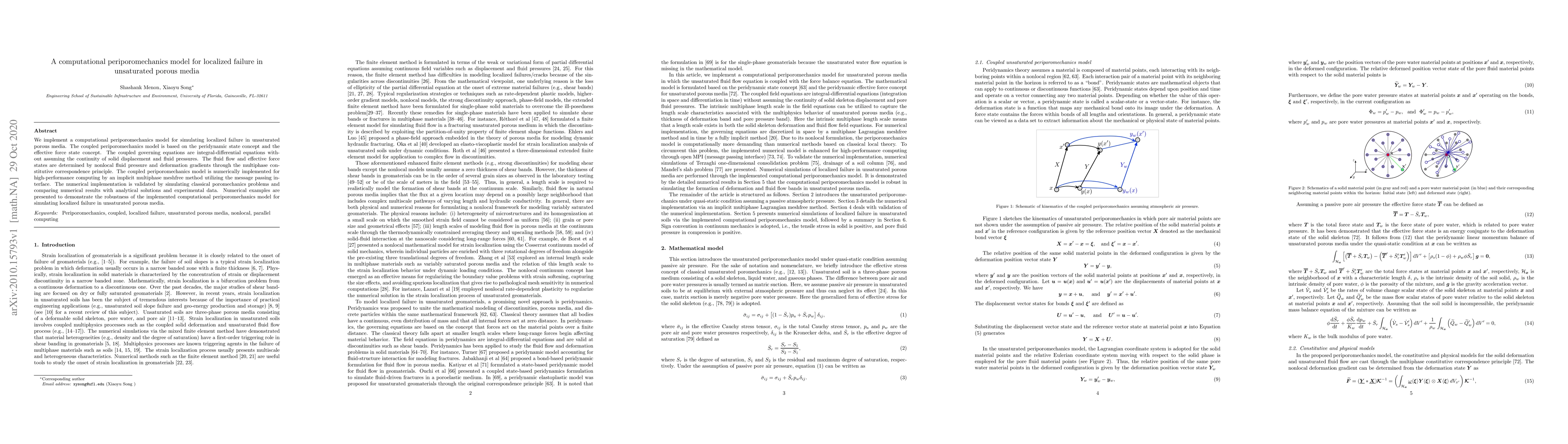 We implement a computational periporomechanics model for simulating localized failure in unsaturated porous media. The coupled periporomechanics model is based on the peridynamic state concept and the effective force state concept. The coupled governing equations are integral-differential equations without assuming the continuity of solid displacement and fluid pressures. The fluid flow and effective force states are determined by nonlocal fluid pressure and deformation gradients through the recently formulated multiphase constitutive correspondence principle. The coupled peri-poromechanics is implemented numerically for high-performance computing by an implicit multiphase meshfree method utilizing the message passing interface. The numerical implementation is validated by simulating classical poromechanics problems and comparing the numerical results with analytical solutions and experimental data. Numerical examples are presented to demonstrate the robustness of the fully coupled peri-poromechanics in modeling localized failures in unsaturated porous media.