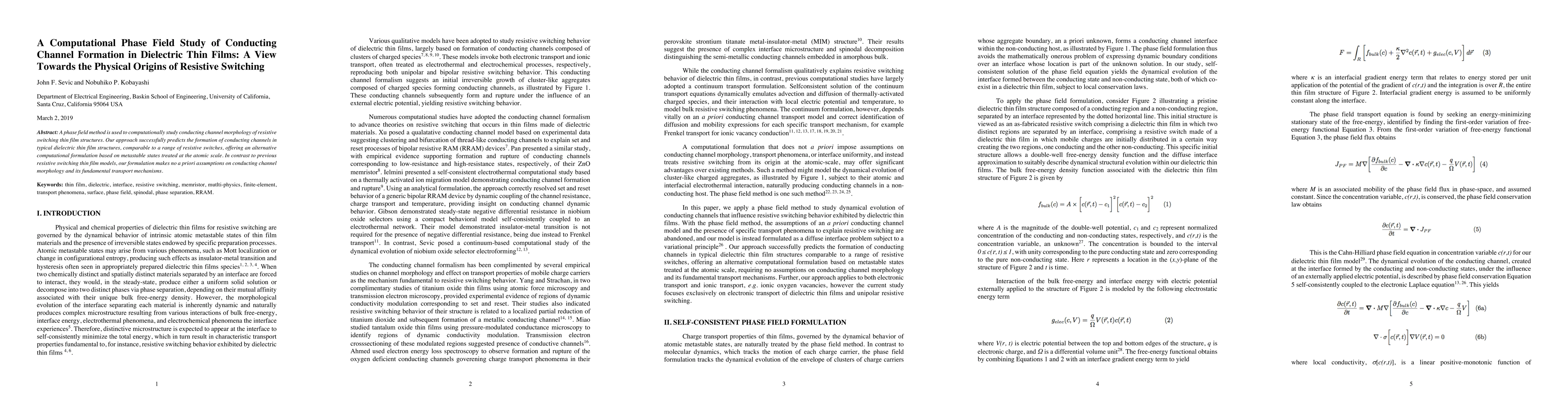 This paper uses a phase field method to computationally study the formation of conducting channels in resistive switching thin film structures, predicting their morphology without prior assumptions on channel shape or transport mechanisms. The method offers a new computational approach based on metastable states at the atomic scale.