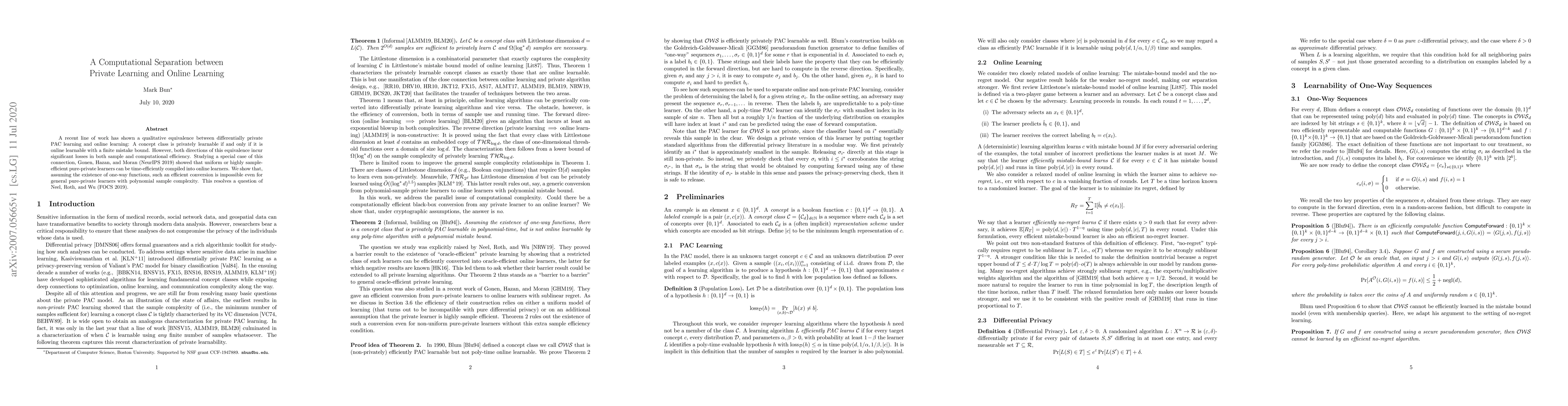 This paper proves that under the assumption of one-way functions, it is computationally impossible to efficiently convert general pure-private learners with polynomial sample complexity into time-efficient online learners, resolving a question posed by Neel, Roth, and Wu. This finding highlights a computational separation between private learning and online learning.