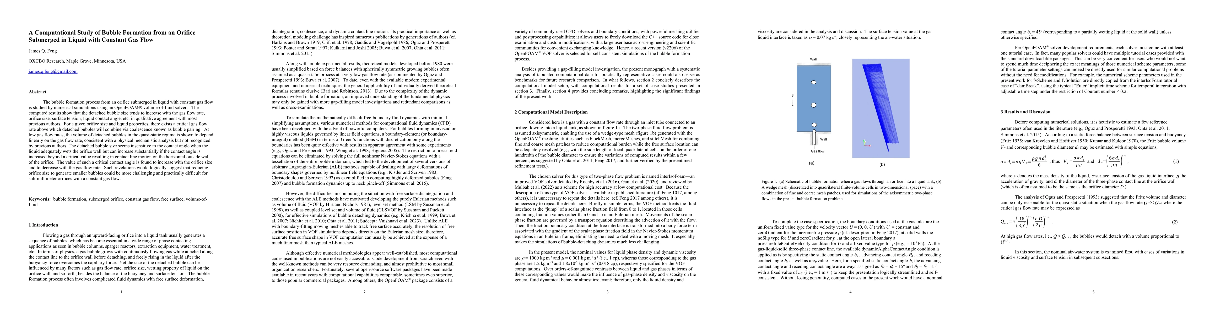 This paper uses OpenFOAM simulations to study bubble formation from a submerged orifice with constant gas flow, showing that bubble size increases with gas flow rate and orifice size. It identifies a critical gas flow rate for bubble pairing and discusses the influence of liquid contact angle on bubble formation, suggesting practical challenges in generating smaller bubbles with reduced orifice sizes.