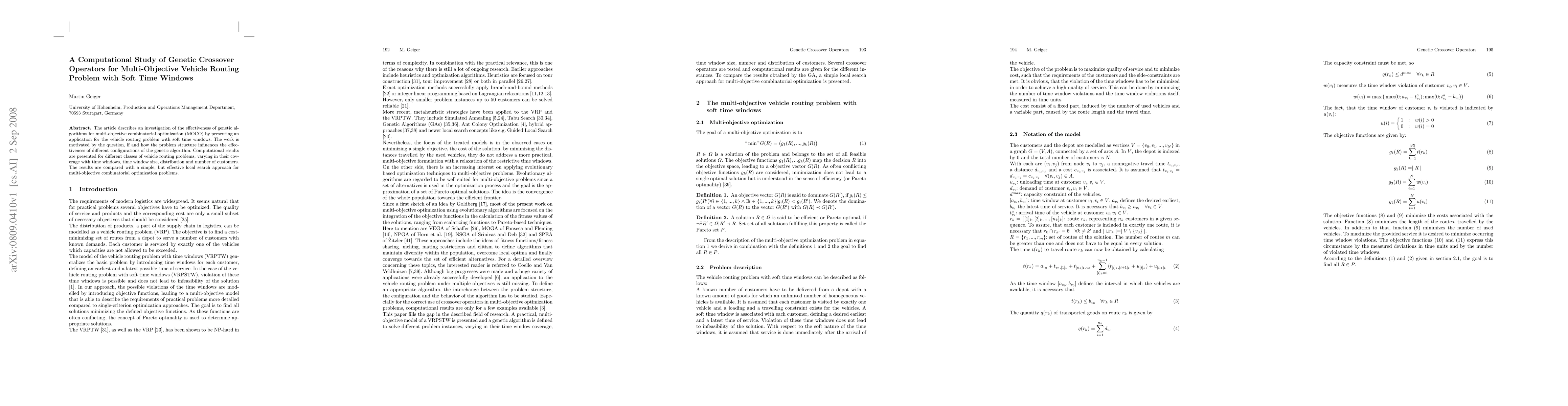 This study evaluates various genetic crossover operators for solving the multi-objective vehicle routing problem with soft time windows, assessing how problem structure affects algorithm performance. Results compare genetic algorithms to a local search approach across different problem configurations.