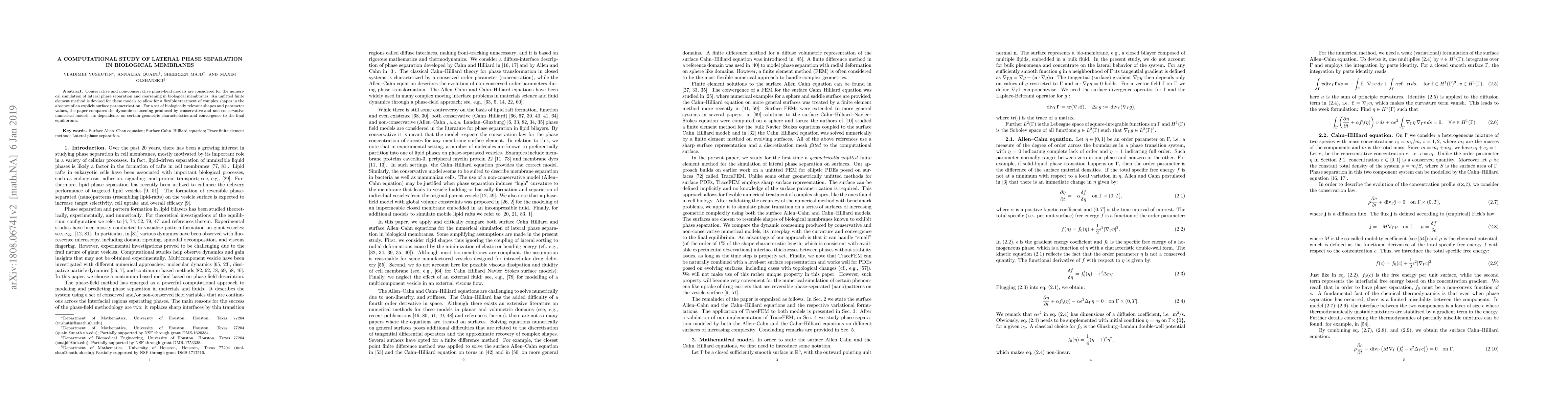 This paper investigates lateral phase separation in biological membranes using conservative and non-conservative phase-field models, employing an unfitted finite element method to handle complex shapes without explicit surface parametrization. It compares the dynamic coarsening behavior and equilibrium convergence of the two models under various biologically relevant conditions.