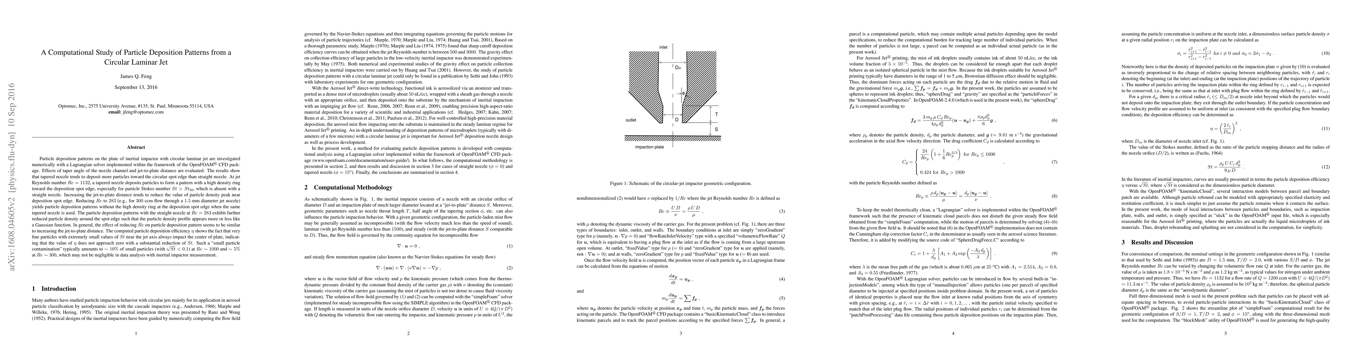Particle deposition patterns on the plate of inertial impactor with circular laminar jet are investigated numerically with a Lagrangian solver implemented within the framework of the OpenFOAM$^{\circledR}$ CFD package. Effects of taper angle of the nozzle channel and jet-to-plate distance are evaluated. The results show that tapered nozzle tends to deposit more particles toward the circular spot edge than straight nozzle. At jet Reynolds number $Re = 1132$, a tapered nozzle deposits particles to form a pattern with a high density ring toward the deposition spot edge, especially for particle Stokes number $St > St_{50}$, which is absent with a straight nozzle. Increasing the jet-to-plate distance tends to reduce the value of particle density peak near deposition spot edge. Reducing $Re$ to $283$ (e.g., for $300$ ccm flow through a $1.5$ mm diameter jet nozzle) yields particle deposition patterns without the high density ring at the deposition spot edge when the same tapered nozzle is used. The particle deposition patterns with the straight nozzle at $Re = 283$ exhibit further reduced particle density around the spot edge such that the particle density profile appears more or less like a Gaussian function. In general, the effect of reducing $Re$ on particle deposition pattern seems to be similar to increasing the jet-to-plate distance. The computed particle deposition efficiency $\eta$ shows the fact that very fine particles with extremely small values of $St$ near the jet axis always impact the center of plate, indicating that the value of $\eta$ does not approach zero with a substantial reduction of $St$. Such a "small particle contamination" typically amounts to $\sim 10\%$ of small particles (with $\sqrt{St} < 0.1$) at $Re \sim 1000$ and $\sim 5\%$ at $Re \sim 300$, which may not be negligible in data analysis with inertial impactor measurement.