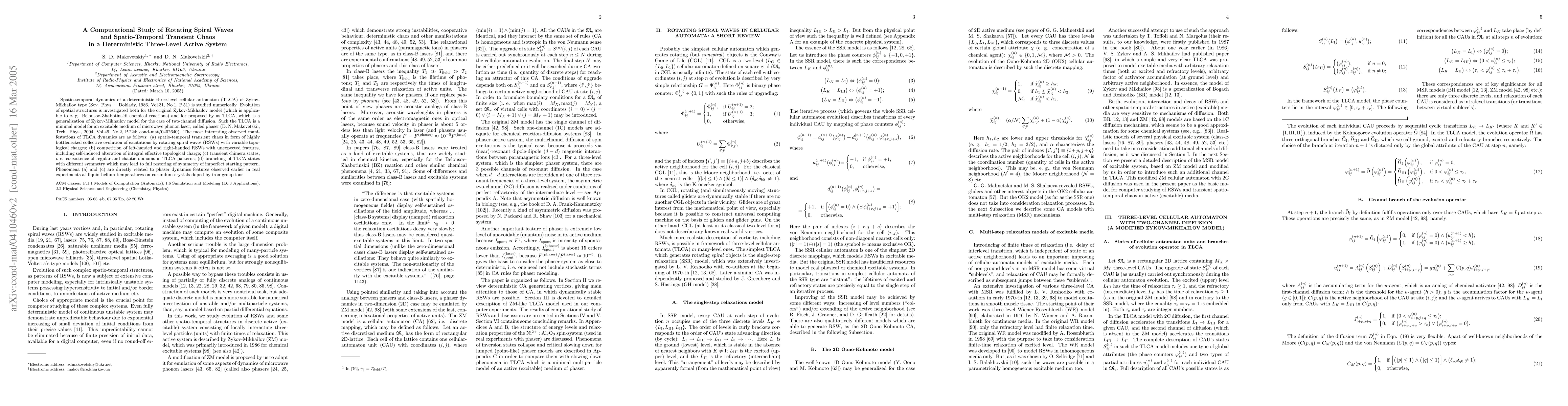 Spatio-temporal dynamics of a deterministic three-level cellular automaton (TLCA) of Zykov-Mikhailov type (Sov. Phys. - Dokl., 1986, Vol.31, No.1, P.51) is studied numerically. Evolution of spatial structures is investigated both for the original Zykov-Mikhailov model (which is applicable to, for example, Belousov-Zhabotinskii chemical reactions) and for proposed by us TLCA, which is a generalization of Zykov-Mikhailov model for the case of two-channel diffusion. Such the TLCA is a minimal model for an excitable medium of microwave phonon laser, called phaser (D. N. Makovetskii, Tech. Phys., 2004, Vol.49, No.2, P.224; cond-mat/0402640). The most interesting observed forms of TLCA dynamics are as follows: (a) spatio-temporal transient chaos in form of highly bottlenecked collective evolution of excitations by rotating spiral waves (RSW) with variable topological charges; (b) competition of left-handed and right-handed RSW with unexpected features, including self-induced alteration of integral effective topological charge; (c) transient chimera states, i.e. coexistence of regular and chaotic domains in TLCA patterns; (d) branching of TLCA states with different symmetry which may lead to full restoring of symmetry of imperfect starting pattern. Phenomena (a) and (c) are directly related to phaser dynamics features observed earlier in real experiments at liquid helium temperatures on corundum crystals doped by iron-group ions. ACM: F.1.1, I.6, J.2; PACS:05.65.+b, 07.05.Tp, 82.20.Wt