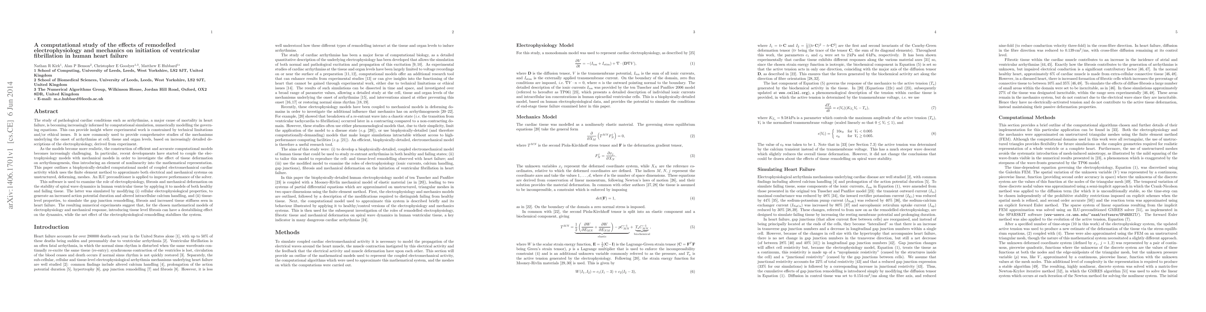 This paper presents a detailed computational model coupling electrophysiology and mechanics to study ventricular fibrillation initiation in heart failure. The model suggests that fibrosis destabilizes spiral wave dynamics, while electrophysiological remodeling has a stabilizing effect.