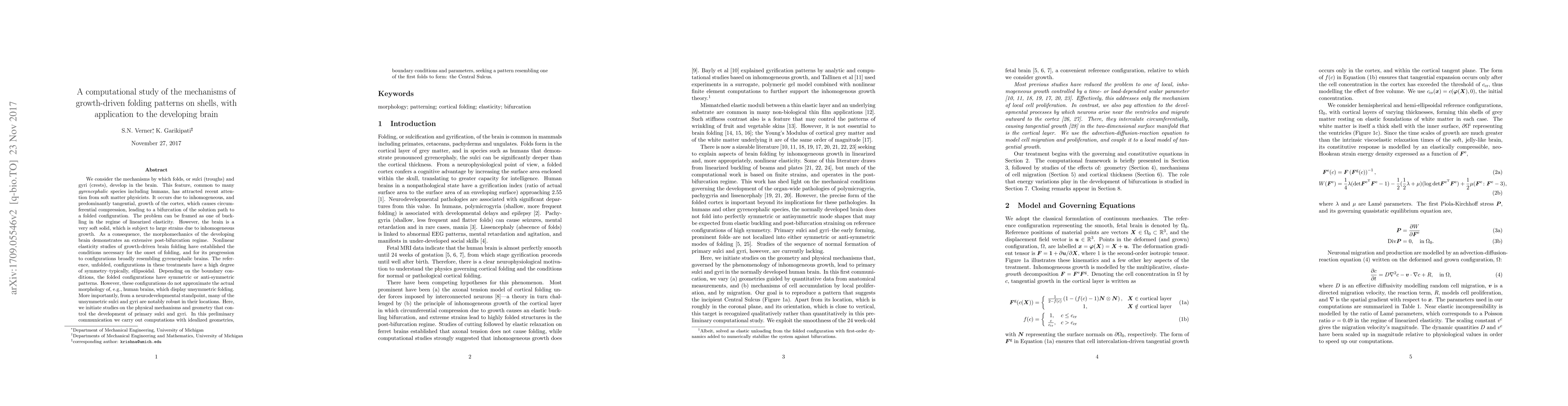 This paper investigates the computational mechanisms behind the growth-driven folding patterns on brain shells, focusing on the development of sulci and gyri due to inhomogeneous cortical growth. The study aims to understand the physical and geometric factors that lead to the formation of the Central Sulcus, a primary fold in gyrencephalic brains, using idealized models.