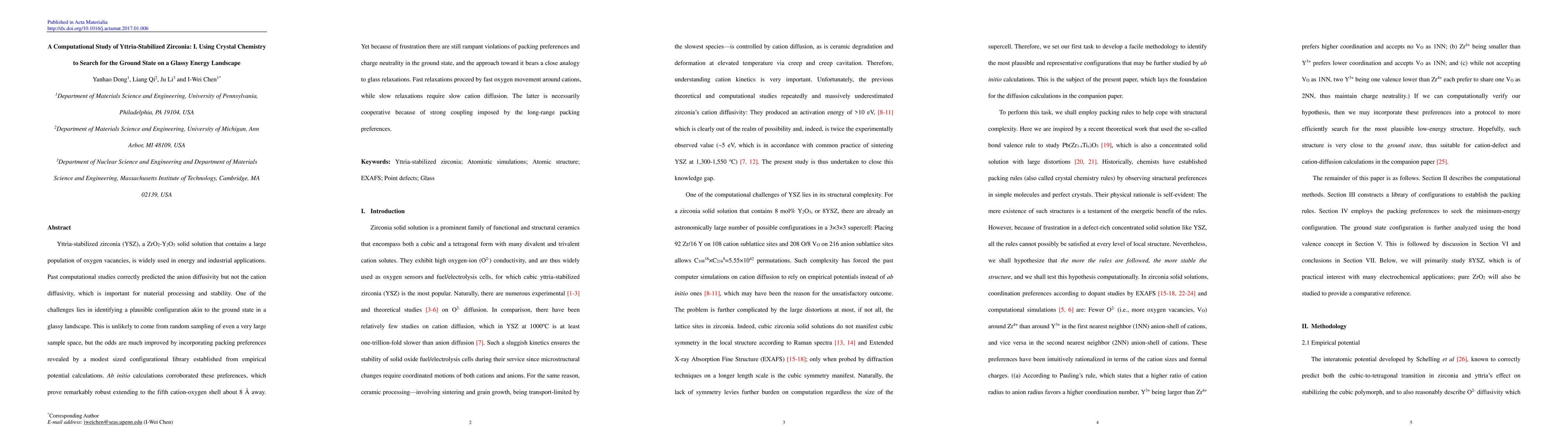 Yttria-stabilized zirconia (YSZ), a ZrO2-Y2O3 solid solution that contains a large population of oxygen vacancies, is widely used in energy and industrial applications. Past computational studies correctly predicted the anion diffusivity but not the cation diffusivity, which is important for material processing and stability. One of the challenges lies in identifying a plausible configuration akin to the ground state in a glassy landscape. This is unlikely to come from random sampling of even a very large sample space, but the odds are much improved by incorporating packing preferences revealed by a modest sized configurational library established from empirical potential calculations. Ab initio calculations corroborated these preferences, which prove remarkably robust extending to the fifth cation-oxygen shell about 8 {\AA} away. Yet because of frustration there are still rampant violations of packing preferences and charge neutrality in the ground state, and the approach toward it bears a close analogy to glass relaxations. Fast relaxations proceed by fast oxygen movement around cations, while slow relaxations require slow cation diffusion. The latter is necessarily cooperative because of strong coupling imposed by the long-range packing preferences.