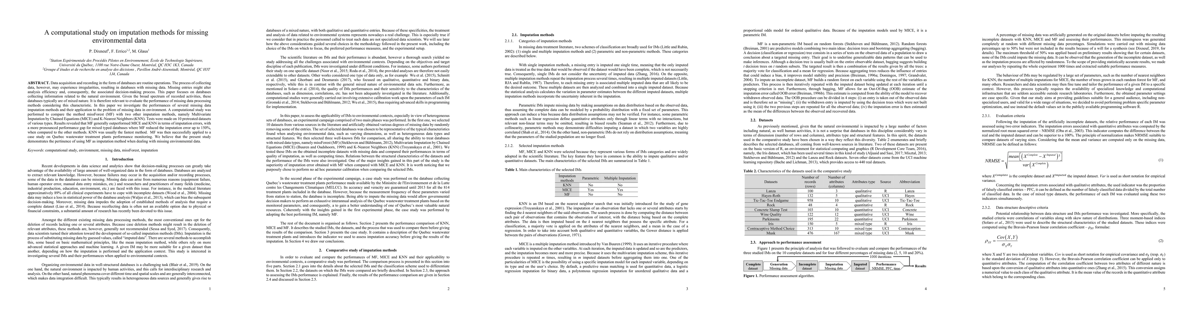 A computational study found that missForest outperformed MICE and KNN in imputation errors for missing environmental data, with a 150% performance gap for mixed-type databases. The method was successfully applied to monitoring Quebec wastewater treatment plants.