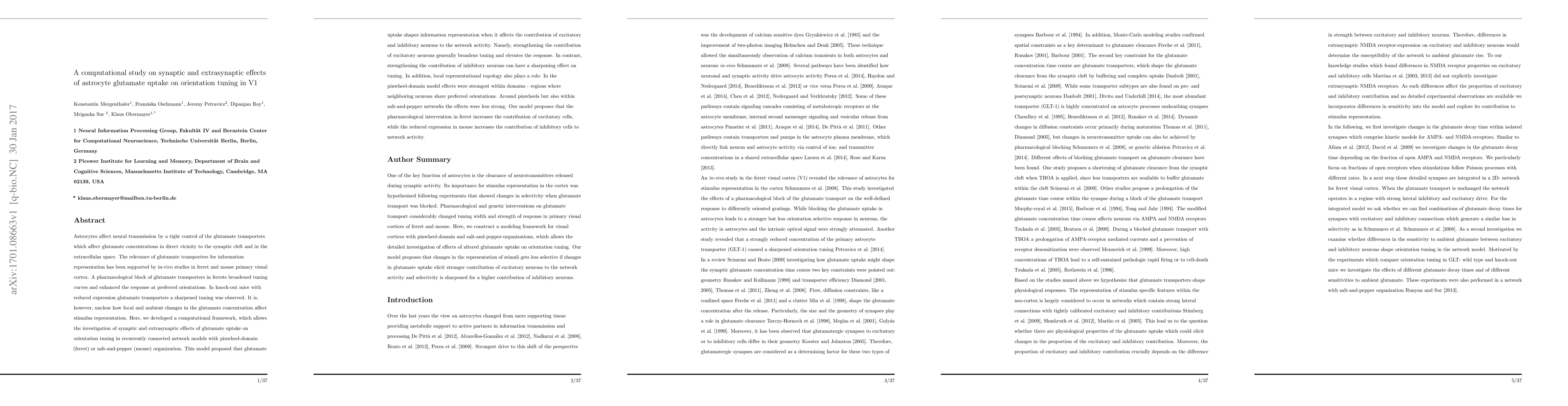 A computational model shows that astrocyte glutamate uptake affects neural transmission by broadening or sharpening orientation tuning in the visual cortex, depending on whether excitatory or inhibitory neurons are strengthened, and this effect is more pronounced within specific domains of neighboring neurons with shared preferred orientations.