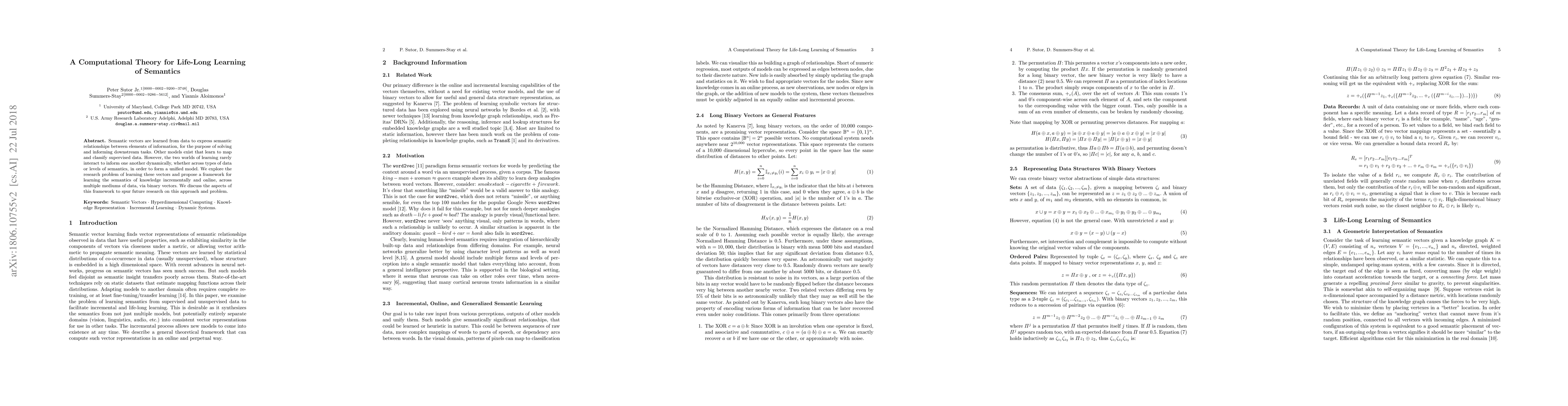 The paper proposes a computational theory for life-long learning of semantics using binary vectors to represent data structures like sets, ordered pairs, sequences, and data records. It introduces a geometric interpretation of semantics based on a knowledge graph and formulates a binary vector analogue for minimizing tension in the system, aiming to find optimal semantic vector placements.