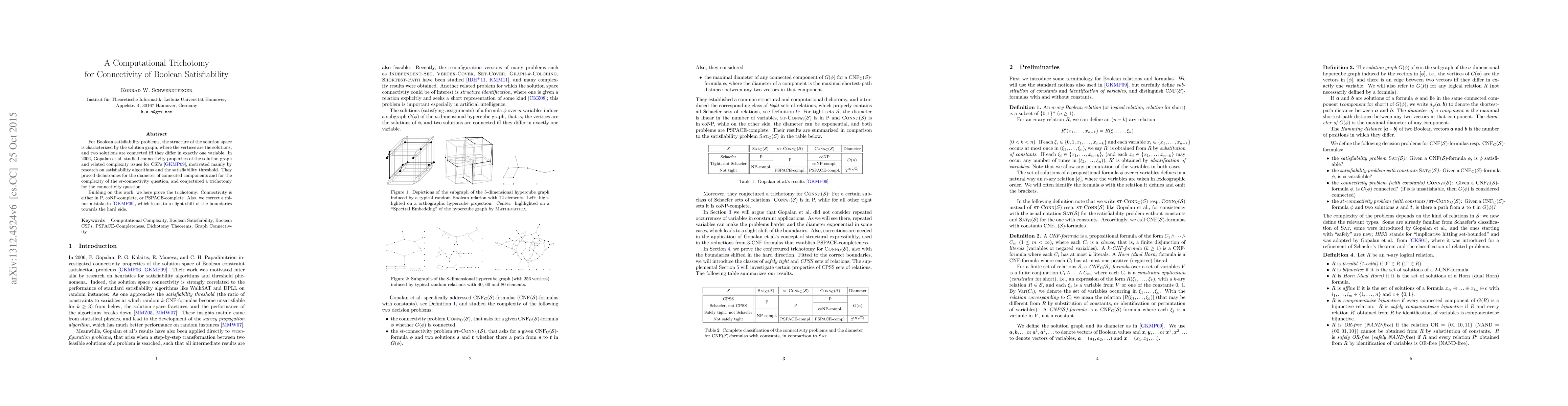 The paper builds upon previous work by Gopalan et al. (2006) on connectivity properties of the solution graph in Boolean satisfiability problems, extending their dichotomies to prove a computational trichotomy for connectivity.