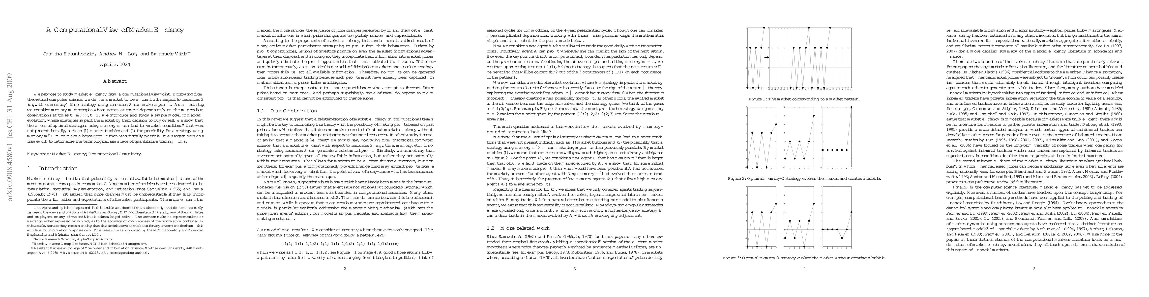 We propose to study market efficiency from a computational viewpoint. Borrowing from theoretical computer science, we define a market to be \emph{efficient with respect to resources $S$} (e.g., time, memory) if no strategy using resources $S$ can make a profit. As a first step, we consider memory-$m$ strategies whose action at time $t$ depends only on the $m$ previous observations at times $t-m,...,t-1$. We introduce and study a simple model of market evolution, where strategies impact the market by their decision to buy or sell. We show that the effect of optimal strategies using memory $m$ can lead to "market conditions" that were not present initially, such as (1) market bubbles and (2) the possibility for a strategy using memory $m' > m$ to make a bigger profit than was initially possible. We suggest ours as a framework to rationalize the technological arms race of quantitative trading firms.