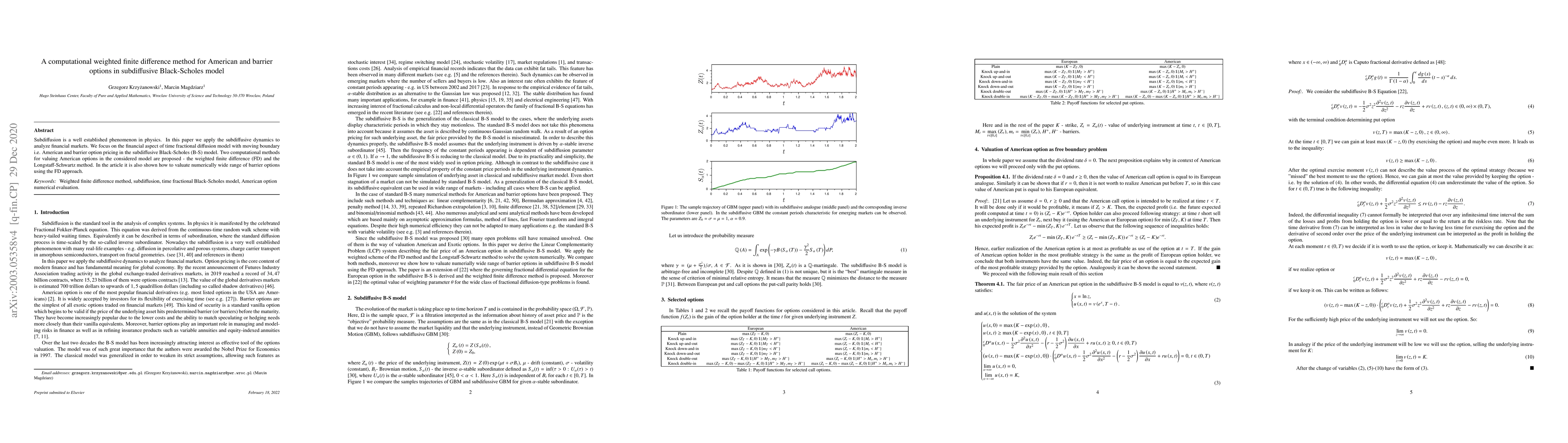 This paper proposes a computational weighted finite difference method for American and barrier option pricing in a subdiffusive Black-Scholes model, incorporating time fractional diffusion dynamics. It also introduces the Longstaff-Schwartz method for American options and demonstrates the FD method for a wide range of barrier options.